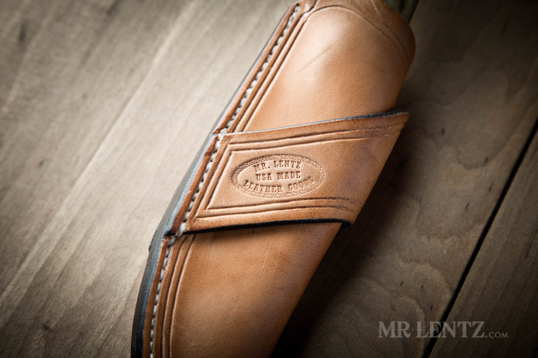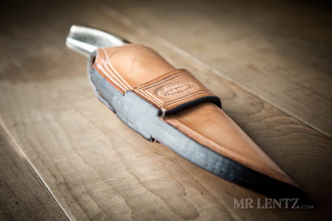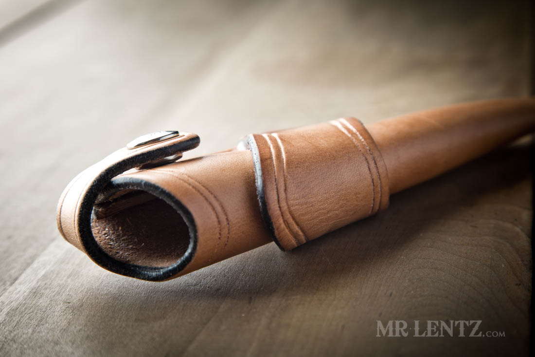 I have been developing the art of hot-wax dipping for all of my sheaths. It’s an old timer method for oiling and waxing leather goods to protect the leather – before any of the environmentally unfriendly chemicals were developed in the mid 1900’s. Hot wax dipping is a method that the ancient Romans were using and likely hundreds if not thousands of years before them too. I consider it a superior method for protecting leather since it penetrates the fibers very deeply and makes the sheath practically water proof. If the sheath ever needs a new coat years down the line, you can easily make your own and re-apply or send it on back to the shop.