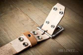 Please see the size chart photo for details on how to get your correct belt size. Don’t use pants or waist size as it will not work. The width of the belt is approximately 1.75 inches and the leather measures just over 3/16″. Made entirely from one piece of Full Grain Leather, not too many belts are made with this high a quality of leather (typically mass-produced goods use two layers of thin ‘Bonded Leather with cardboard sewn in between for bulk, no joke!)