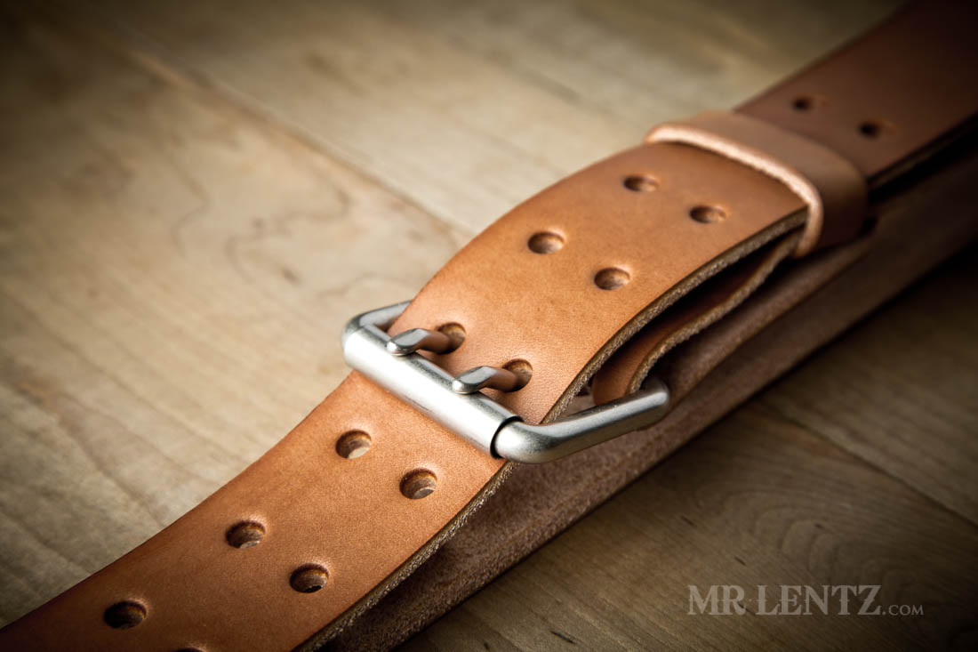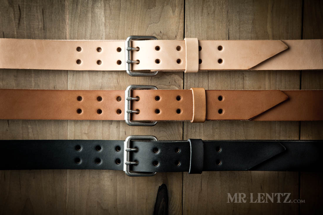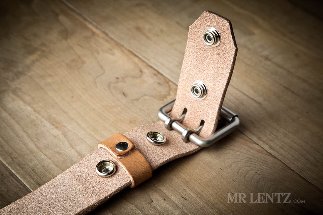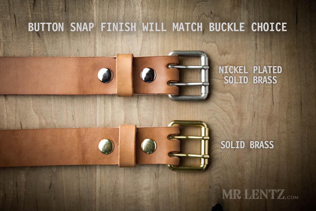Two double tongue belt buckle options. Solid brass or nickel plated solid brass. Snap hardware will match your buckle choice. Exact buckle shapes may vary slightly over time as our buckle supplier alters the design.