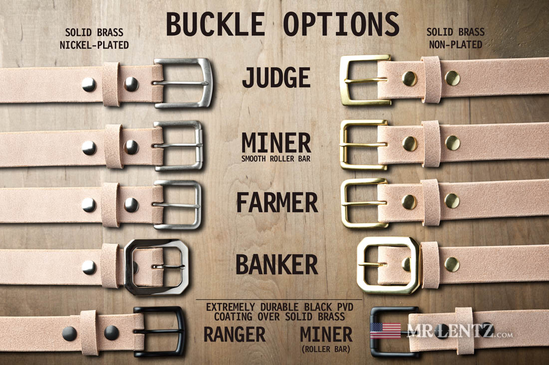 All buckles are available both in Solid Brass as well as Nickel Plated Solid Brass. The Miner Buckle has a roller on the end of it. Exact buckle shapes may vary slightly over time as our buckle supplier alters the design.