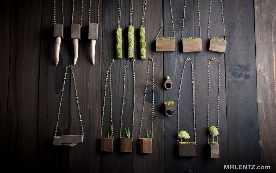 All goodness comes in threes. Starting with the upper left in a clockwise direction: three deer antler necklaces with a subtle curve that follows the breastline, three ‘reindeer moss’ necklaces inspired by how moss and lichen grows in the redwood forests, three mood mood moss necklaces simple and chic, one tall and one wide tree made out of real tree parts and reindeer moss with a grassy bottom of mood moss, one all wood ring with reindeer moss and subtle curves, one adjustable ring with a miniature wooden planter full of mood moss, three flower vase pendants to store your favorite garden varieties, and lastly a wood and elk hair necklace with modern appeal in rustic fashion.