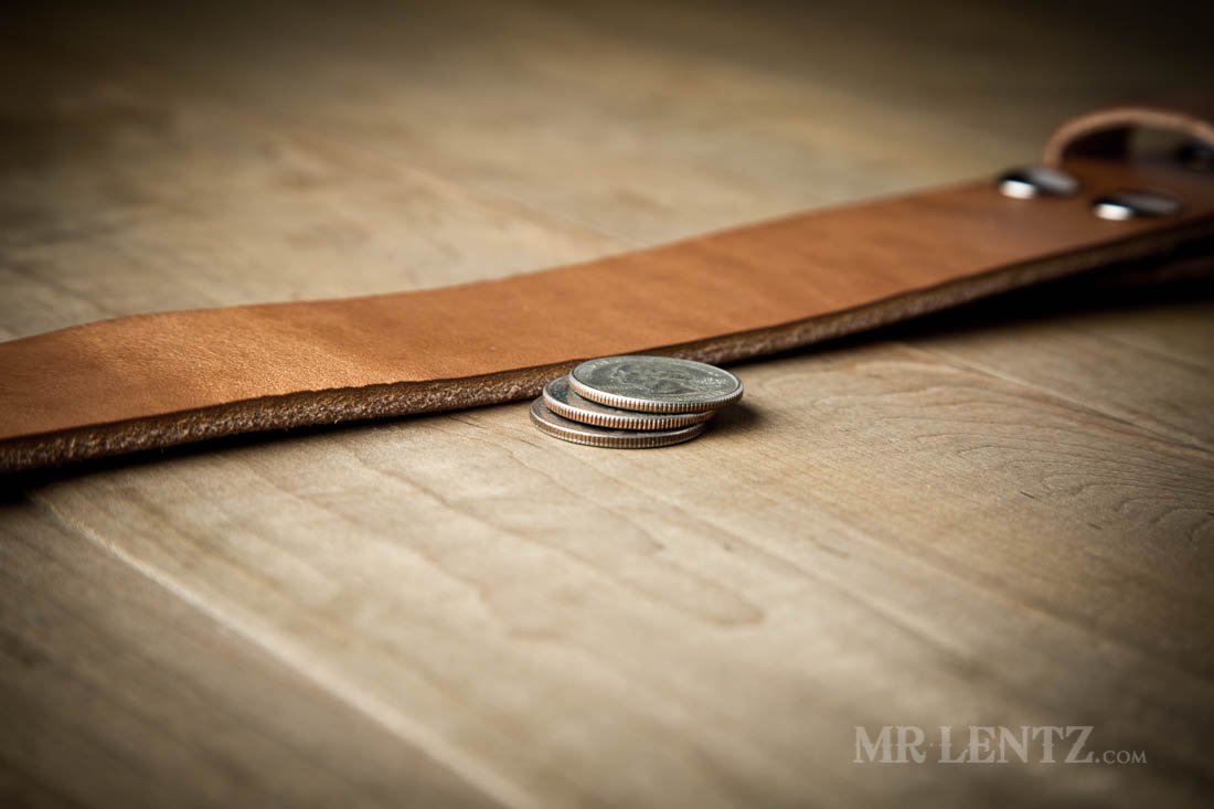 Please see the size chart photo for details on how to get your correct belt size. Don’t use pants or waist size as it will not work. The width of the belt is approximately 1.75 inches and the leather measures just over 3/16″ thick. Made entirely from one piece of Full Grain Leather, not too many belts are made with this high a quality of leather (typically mass-produced goods use two layers of thin ‘Bonded Leather with cardboard sewn in between for bulk, no joke!)