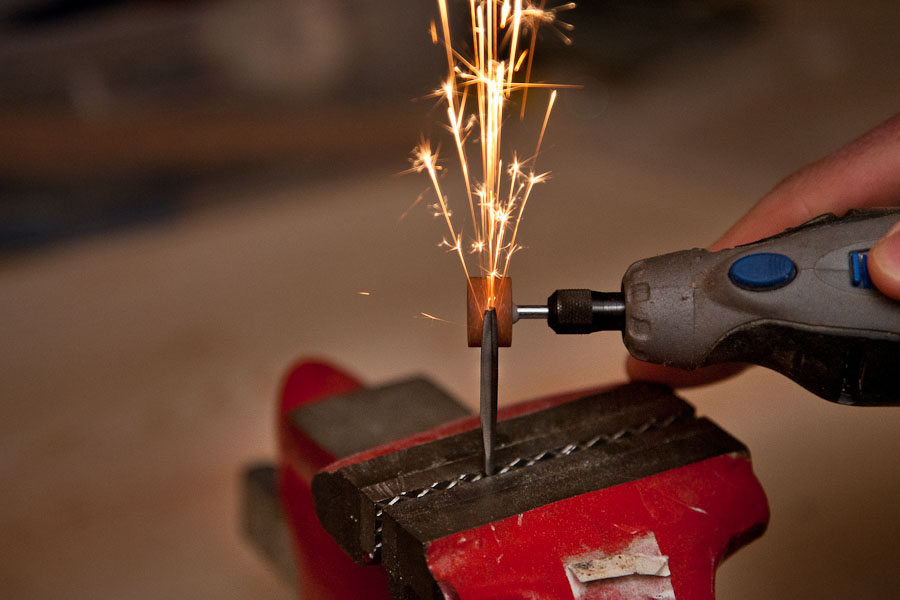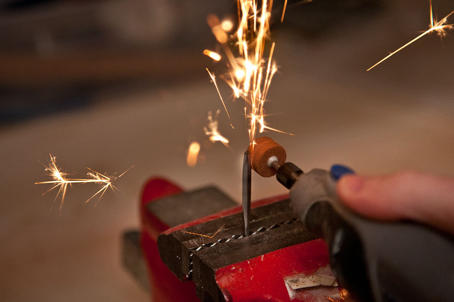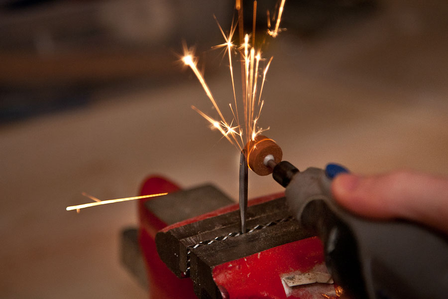 Securing the awl tip in my table vice, I then whipped out my dremel and put a grinding tip on it. After a few brushes against the metal, I realized I had created a miniature fireworks show right in the workshop…so as any good Maker would do – I grabbed my camera so we could all share this experience together.