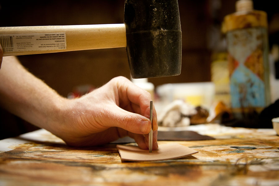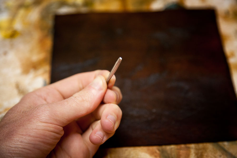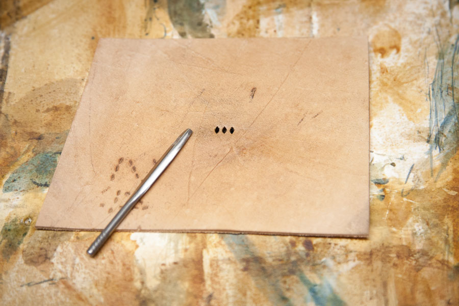 I then wet a cutting of vegetable tanned leather and gave a few swift knocks, indenting the diamond shape.