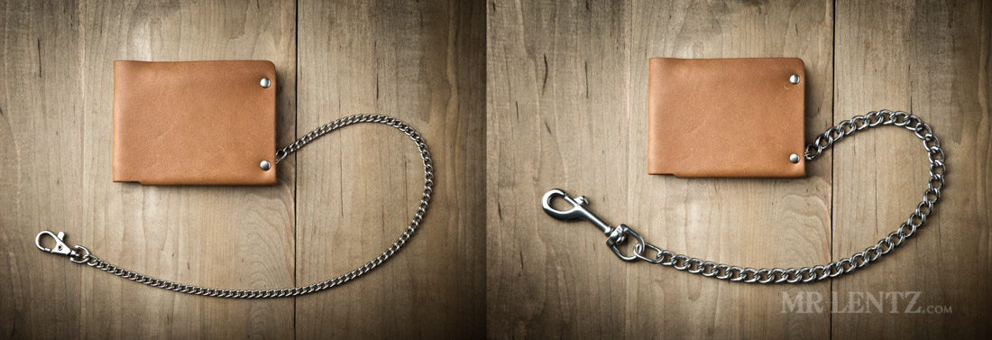 It’s been several years since I first introduced the chain versions of many of my leather wallet designs, and now I am adding a new option. If you are looking for something bigger, stronger and made of stainless steel, well – I found the perfect chain for you. The original version ‘Option A’ was picked for its minimal and light nature. It serves its purpose quite well and suits the needs of most chain wallet wearers. After some time and a few special requests for another option, I found this stainless steel version. It’s slightly heavier, but includes a solid stainless steel clip at the end. I am always looking to improve my leather goods and generally add things to the shop when y’all start asking for the same things. That’s the beauty of being a small U.S. leather workshop I guess!