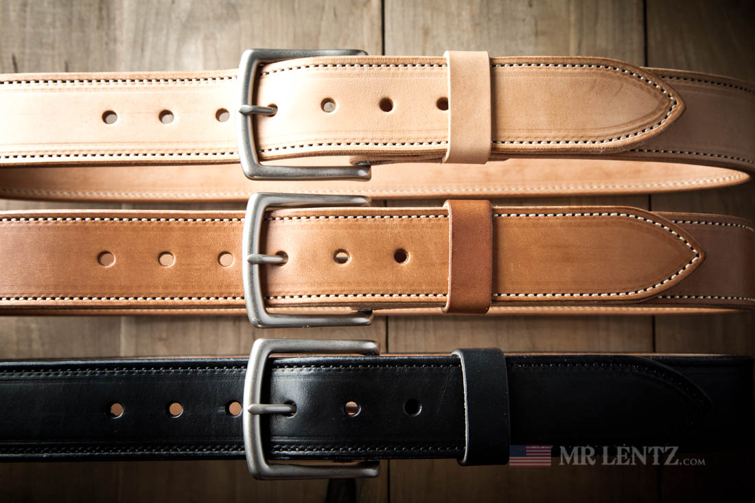 Using two layers of the finest U.S. Full Grain leather glued and stitched together for an incredibly durable belt. Most people will find this is the perfect match of durability and versatility especially if you carry different weapons on occasion. It will handle full size weapons fine and even a mag clip or two. The inner facing layer is always Tan to prevent dye rub off, and the outer layer is your choice.