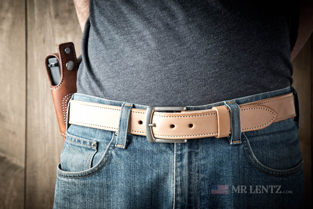 By far the strongest gun belt around. You can load up this belt with a full size weapon, several mags and probably a bit more. I use a high grade of spring steel sandwiched in between the leather starting just before the tightest hole setting and ending just before the chicago screws. The belt is highly resistant to pinching on the width and bowing overall. It’s actually still fairly comfortable to wear.