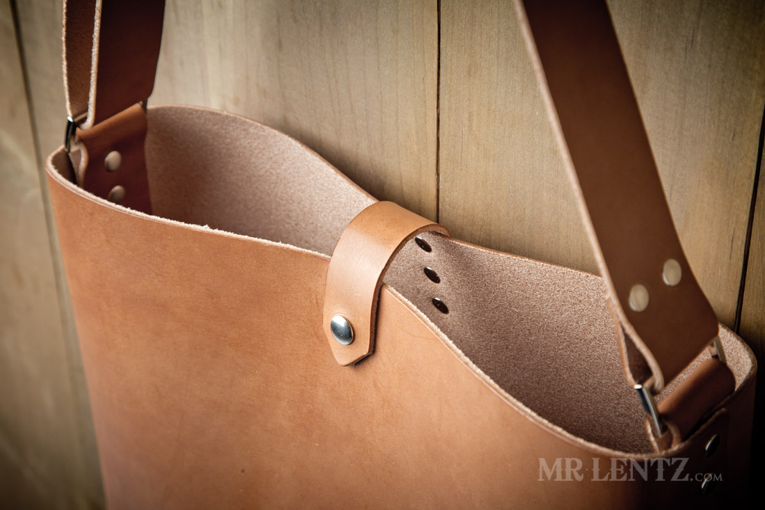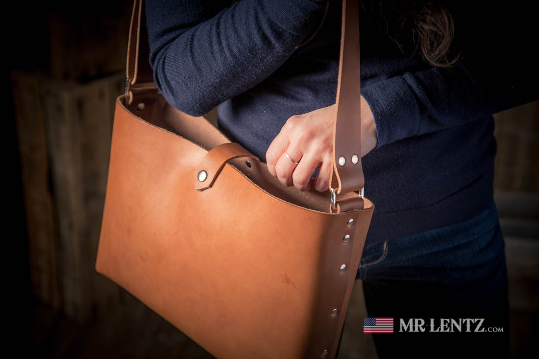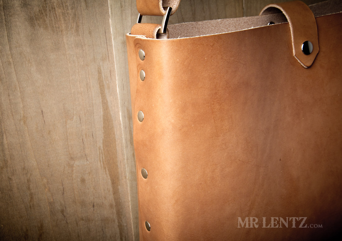 Personalization for the Leather Tote Bag will go on a small tag riveted to the front exterior.