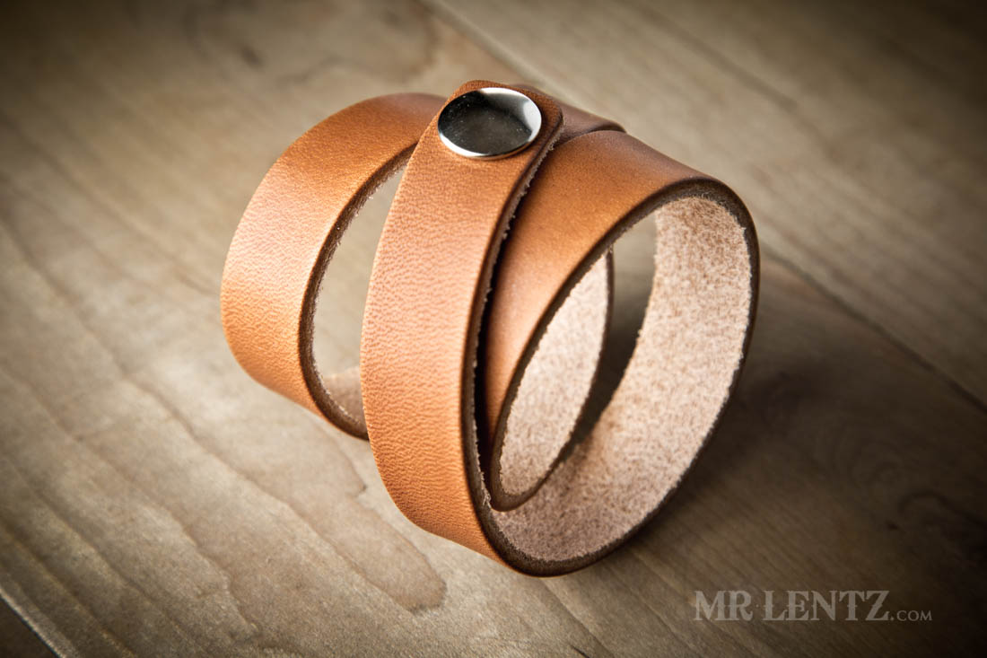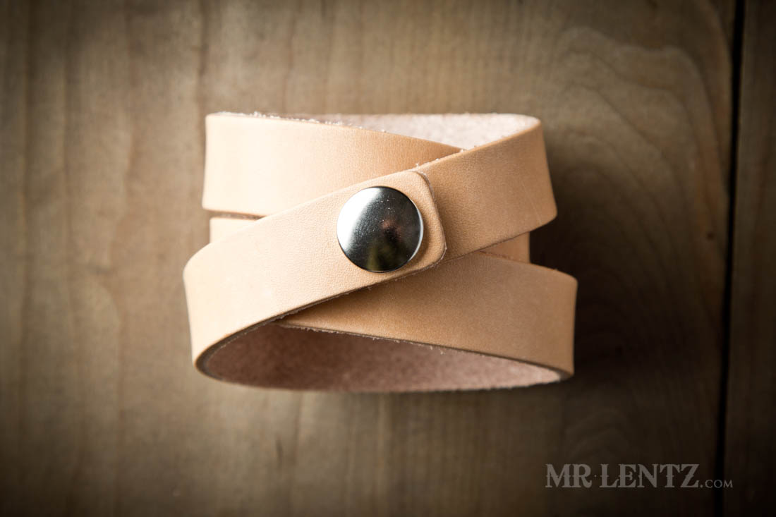 This piece includes a solid brass nickel plated snap and U.S. Full Grain Leather. The leather part measures approximately 11/16 inches wide and will be cut to fit a 6 inch wrist, but you can always stretch it a bit by hand if you have a larger wrist.