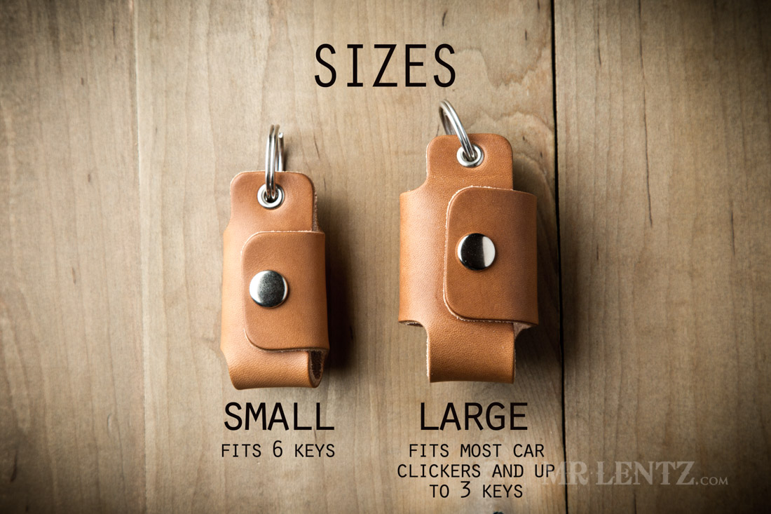 The Large will fit most standard electronic car clickers plus around 2 more standard keys. The Large measures about: INTERIOR MEASUREMENTS: Length from bottom of ring to leather: 2 5/8″ x Width 1 5/8″ x Depth 3/4″ // Exterior Measurements: 3.25″ long x 1.75″ wide x 1.5″ thick.