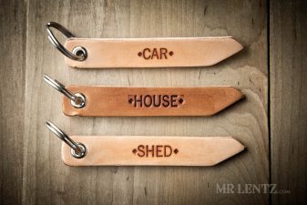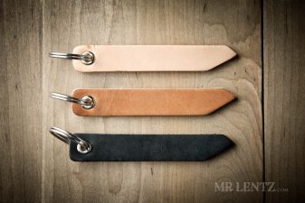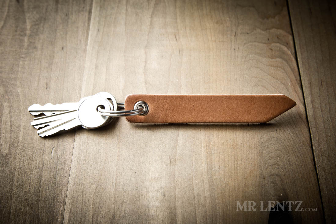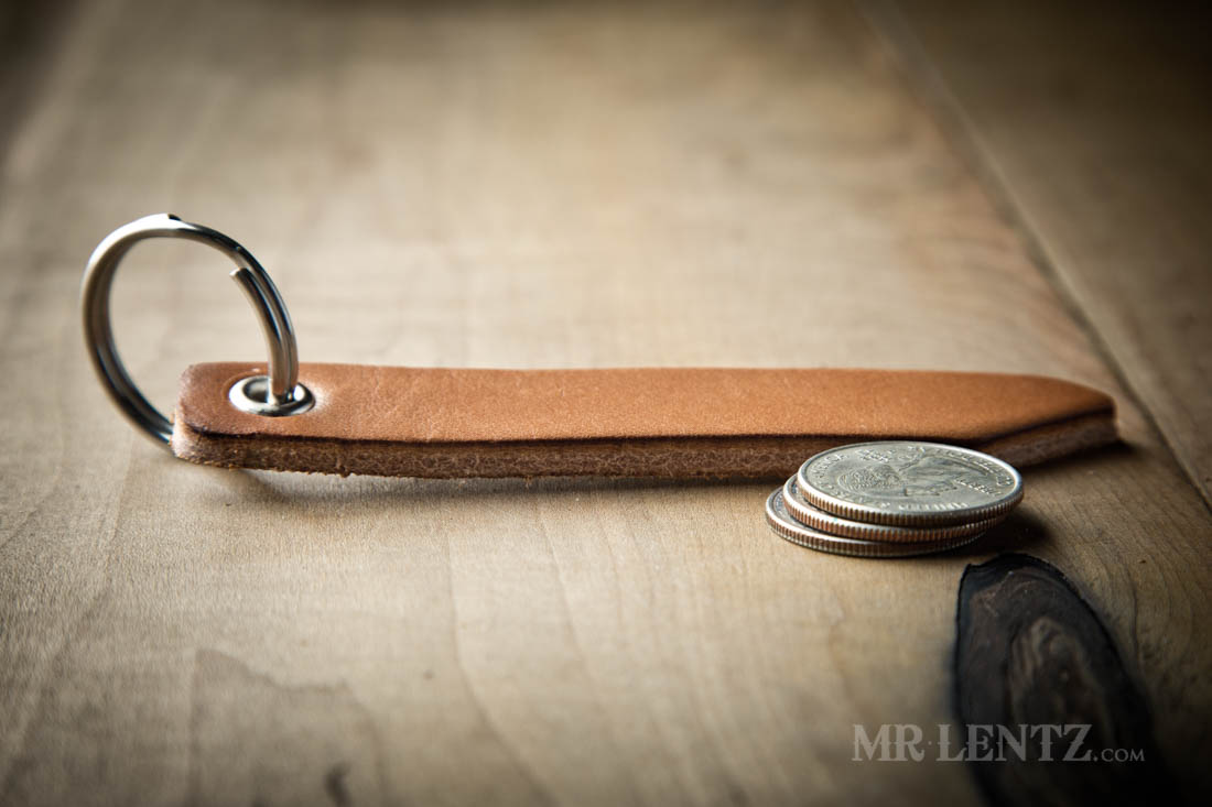 This piece includes a stainless steel split ring, solid brass nickel plated grommet and U.S. Full Grain Leather. The leather part measures 4.25 inches long x 5/8 inches wide x 3/16 inches thick.