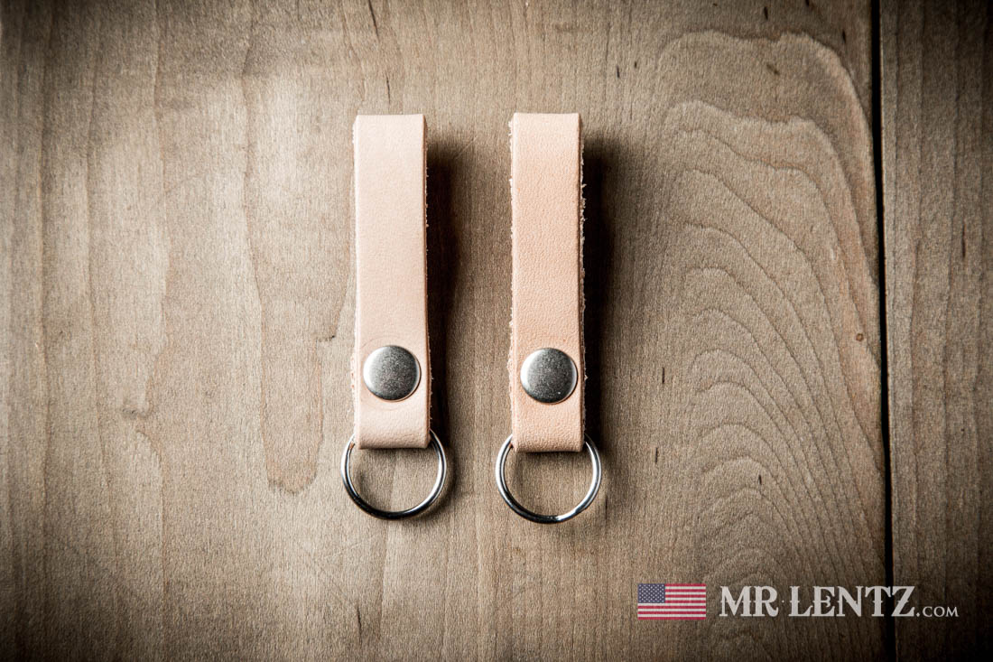 These zipper pulls feature U.S. full-grain leather, a solid brass with nickel plated rivet, and a stainless steel mini split ring.