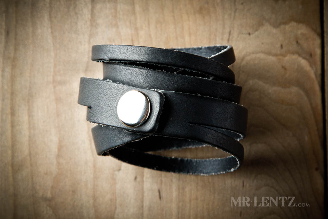 This piece includes a solid brass nickel plated snap and U.S. Full Grain Leather. The leather part measures approximately 11/16 inches wide and will be cut to fit a 6 inch wrist, but you can always stretch it a bit by hand if you have a larger wrist.