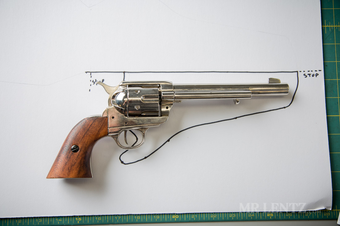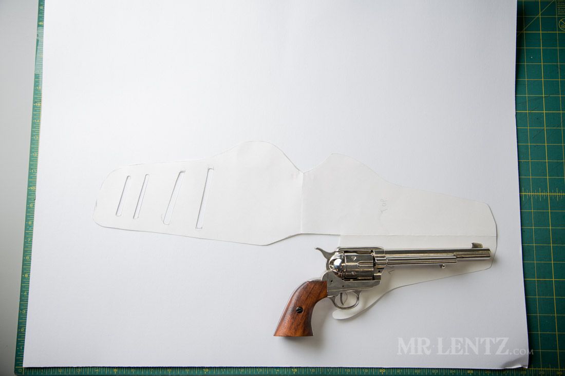 Place the unloaded gun in the lower right quarter of the paper (this tutorial is set up for a right handed holster just FYI). As you can see in the photo I show the end pattern we are going to create, so you have an idea of where we are headed.