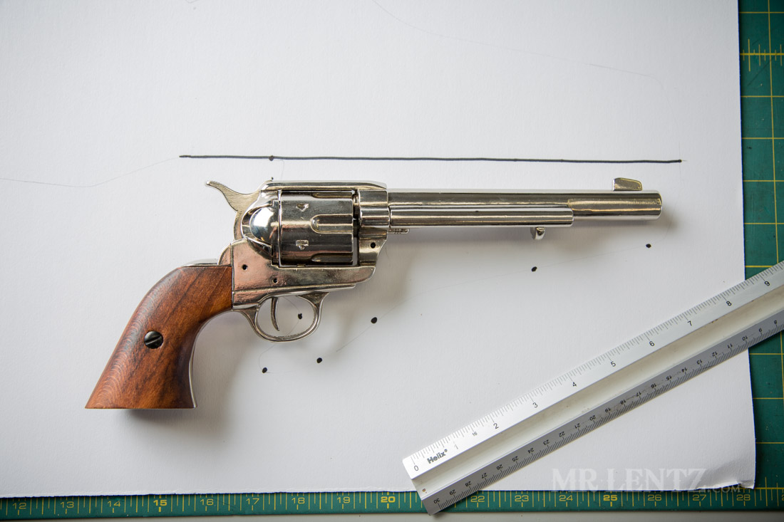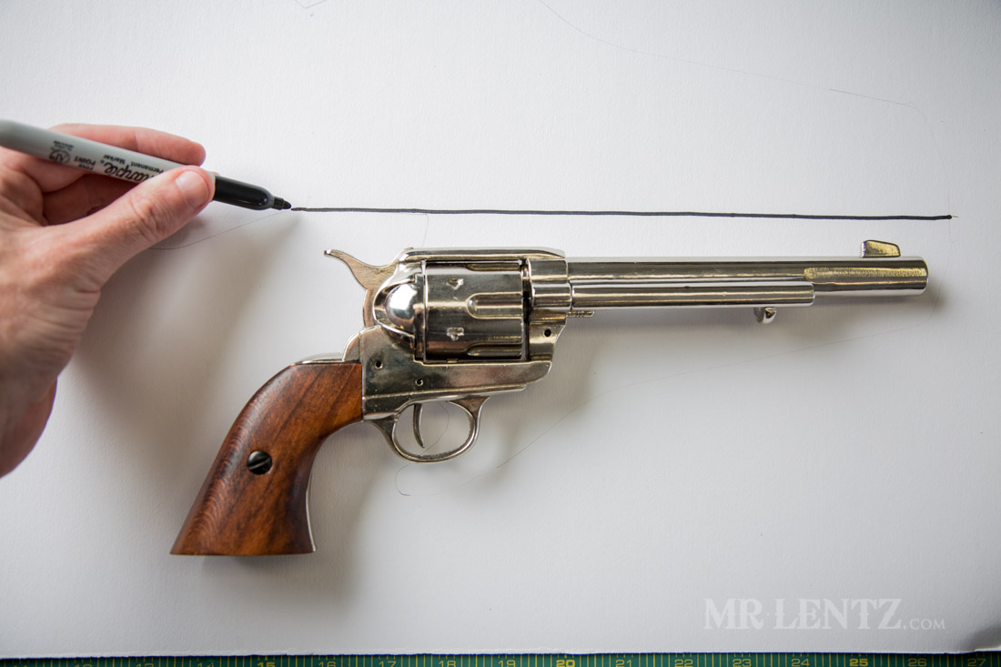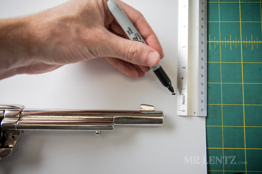 Now make marks 1/2″ below any significant protrusions on the gun. From right to left I started with the barrel tip, the bullet ejector, the start of the body of the gun (i’m sure there’s an actual name for that, chime in if you know it!), beginning of the trigger guard, the end of the trigger guard. I also put a dot just in the middle of the trigger area slightly forward, and a random dot at the top of the gun where the cylinder ends just for reference.