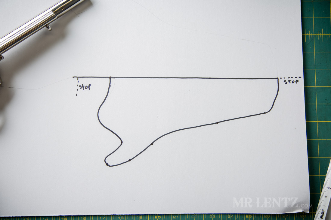 Take a look at the straight line you drew at the very beginning. I drew a dotted line so you can see how I am imagining an extension off of it. This line represents where the holster will bend again to make the back skirt that secures it around the belt. The angle of this line will affect how the gun will draw out of the holster.