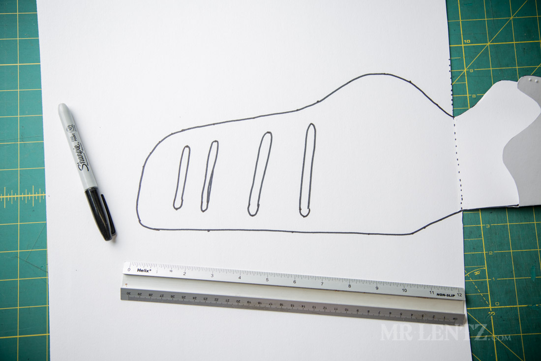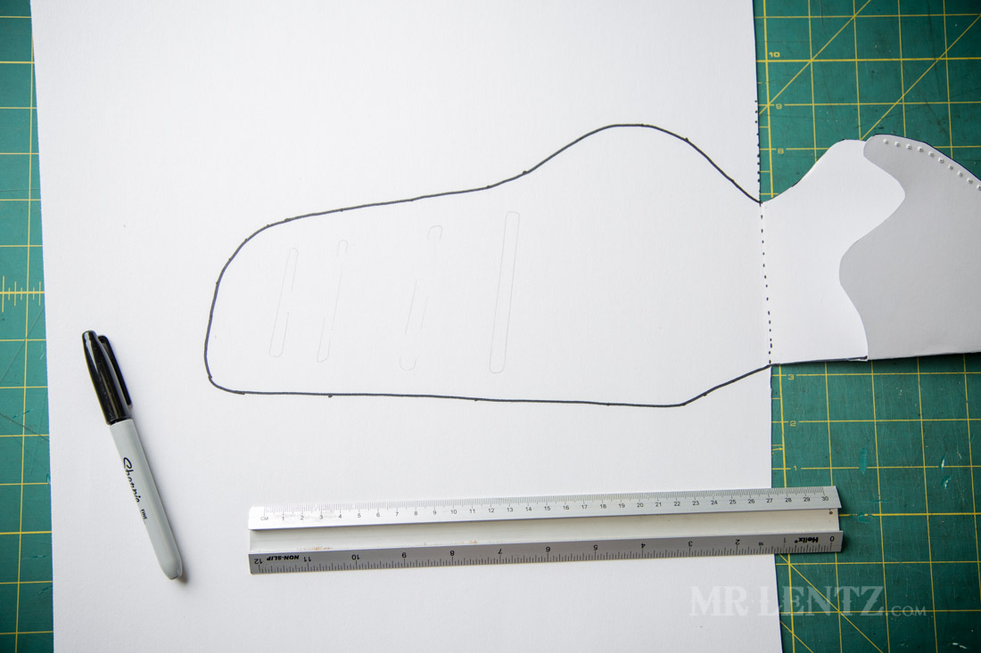 Make a line parallel to the barrel of the gun about 3/4″ above the barrel, go past the tip of the barrel about 3/4″ and end it right about where the curve of the handle starts to go down. This line will become the fold line in a few minutes – that way we can duplicate the shape like a butterfly wing so it matches up when the stitching takes place.