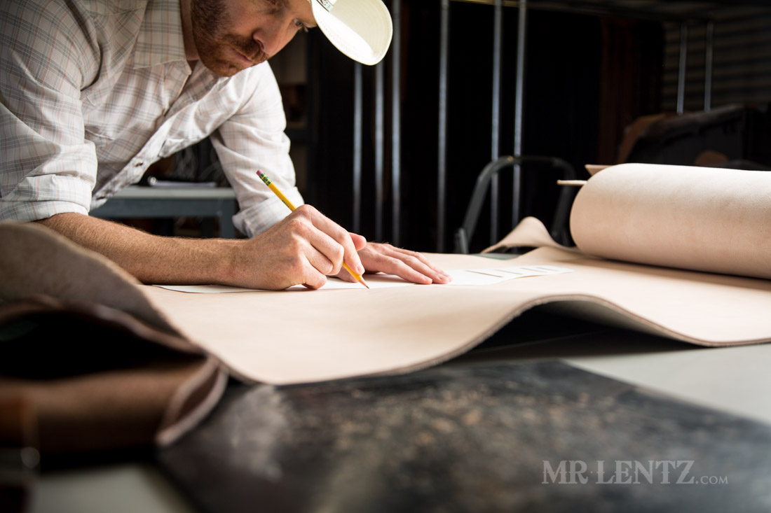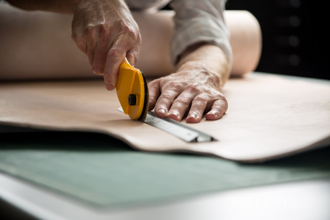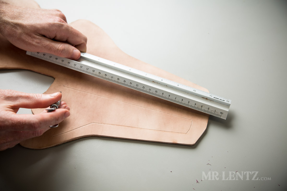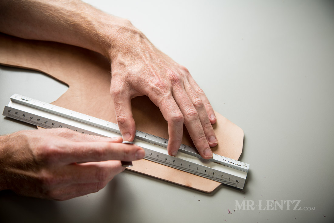 After it’s traced I begin cutting out the shape with a variety of tools. Usually I start with the rolling blade and a ruler for all the easy straight cuts. Careful not to over cut with the razor, as a nick in the leather here may turn into a tear a few years later.