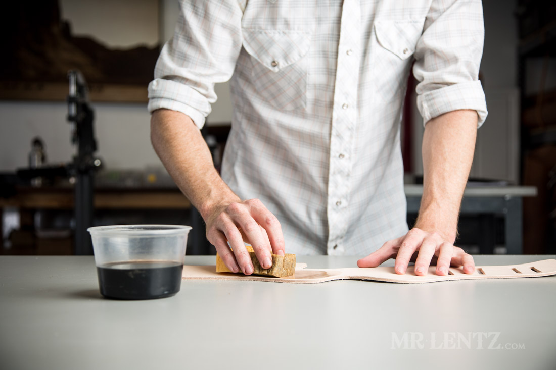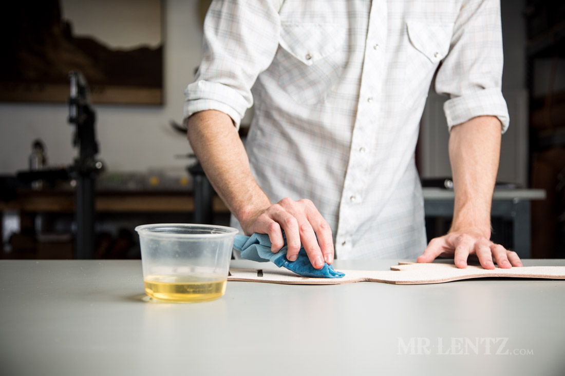 After putting a layer of dye on the top side only, I flip the leather over and apply a medium-thin layer of oil to it. There are many types of oil you can use with vegetable tanned leather, though some do think that certain oils can go rancid, or possible degrade the leather over time. I urge you to experiment with this step and see what works for you. The idea of oiling leather is simply to replenish the oils that wash out of the leather when you dye it and work it. Oils help to lubricate the fibers and keep leather from cracking and breaking down. It’s also important to note that oiling should be done in a few thin layers vs one thick one. It can be easy to over-oil, and your piece will look soggy and gross. It’s a hard thing to fix too.
