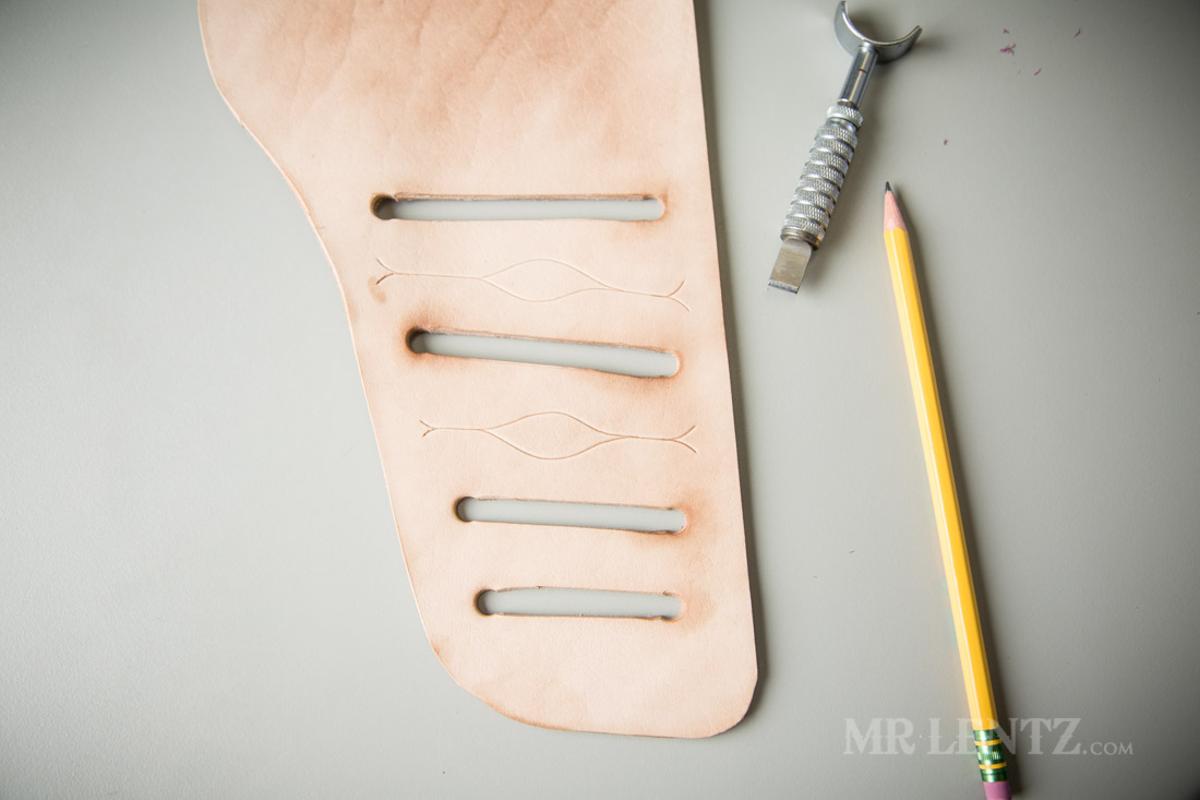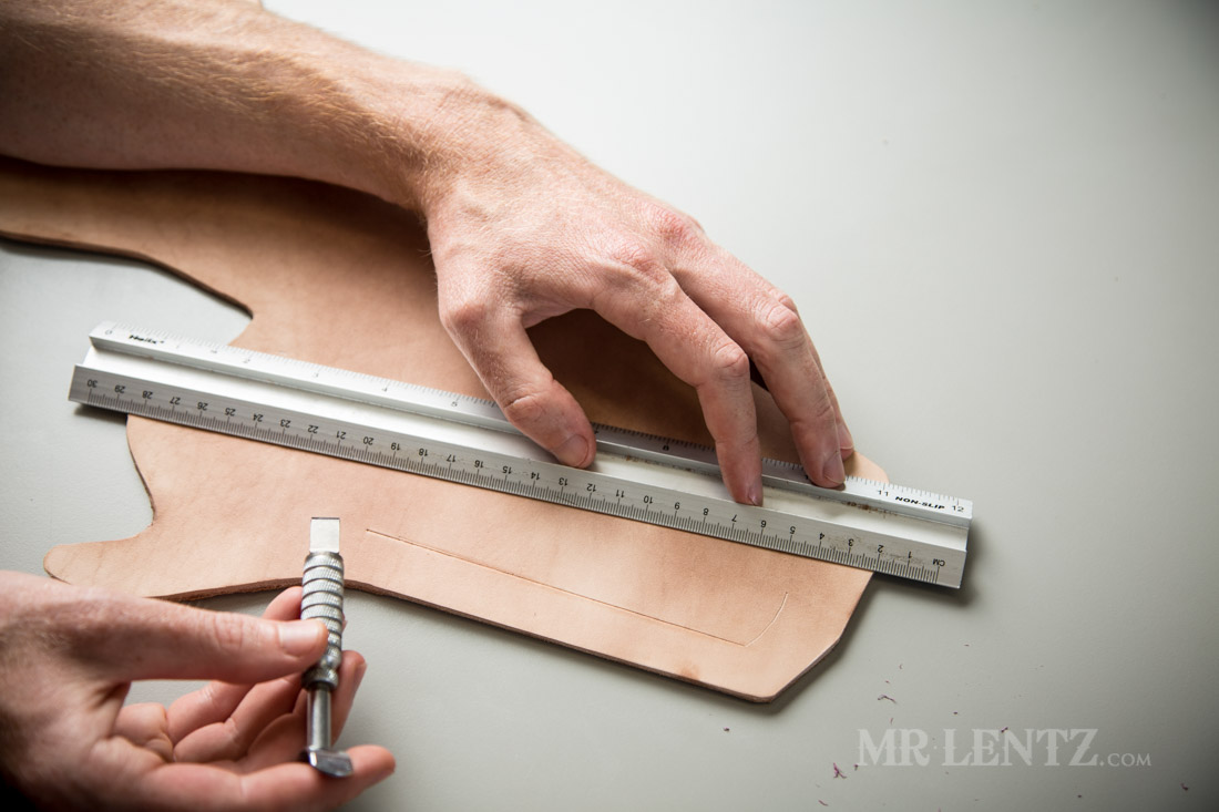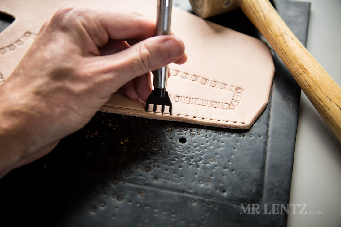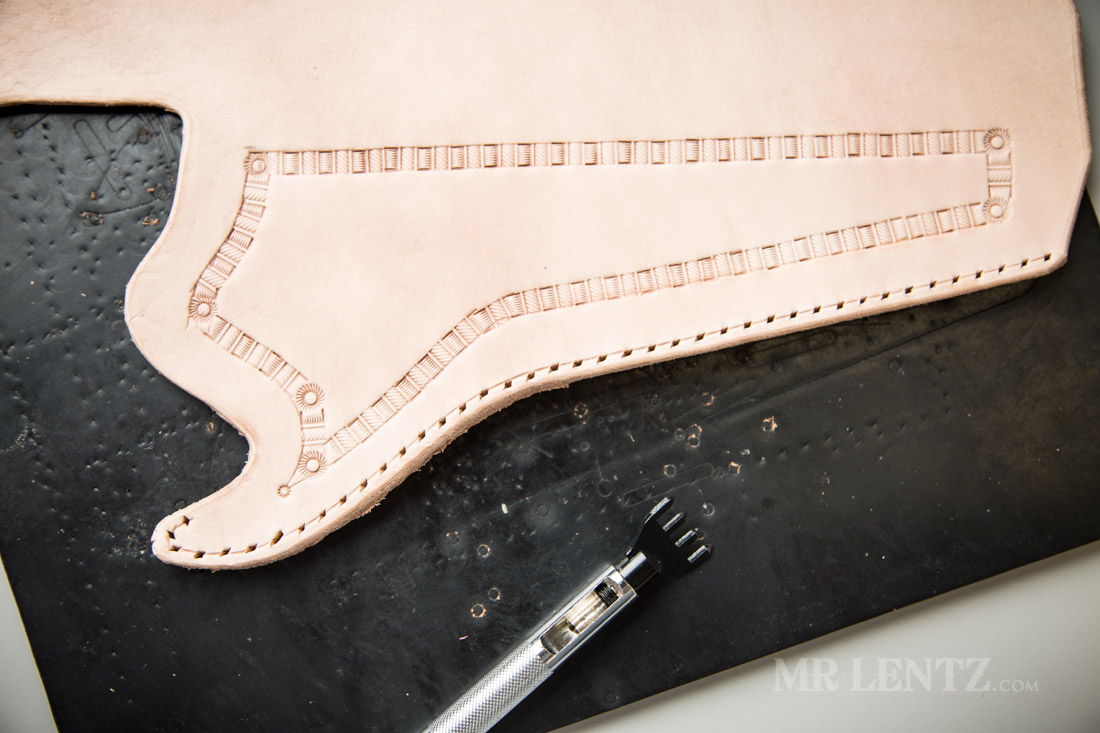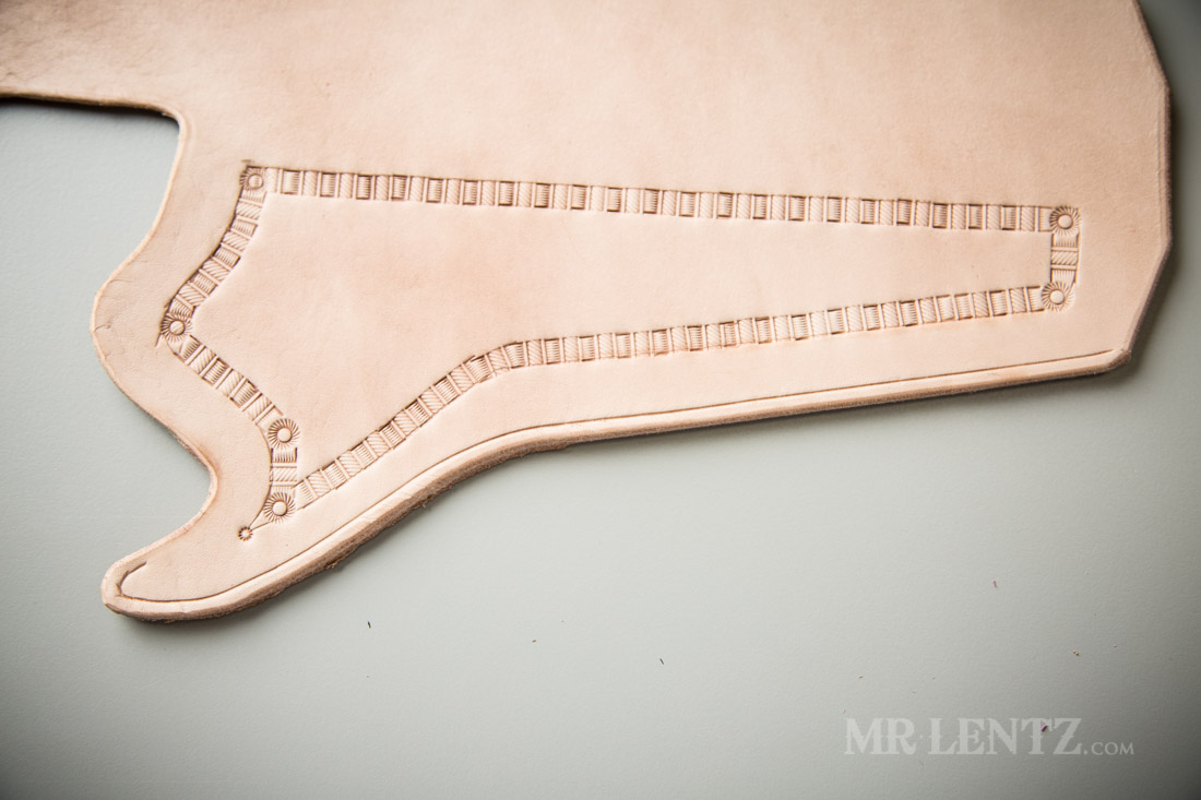 To give the holster a bit more character I used the swivel knife and ruler to lay out reference lines I would the use to stamp designs along.