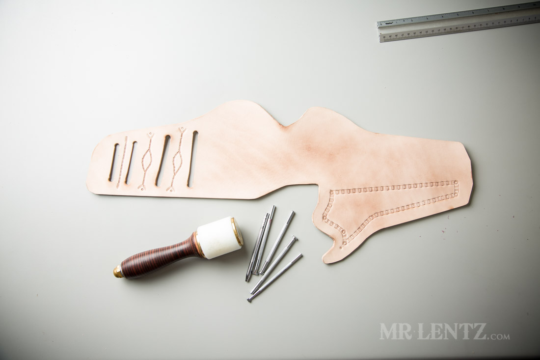 Laying the holster out on the table, it looks like it’s finally coming together. One critique I have at this point is to use a diamond punch set with closer spacing. The closer spaced ones have a more refined look.