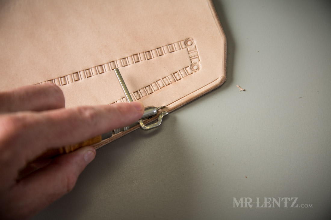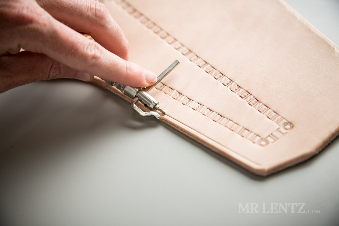 With the stitch line creaser I mark a line 3/16″ in from the edge. Now I really should have done this before beveling the edge as it is much easier to use the tool, but I’m always up for a good challenge.