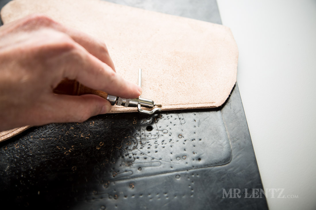 Going back along that line I use the diamond stitching punch and set all of the holes on one side. Each time I lift the punch – I set the last punch chisel into the previous hole – that way things are evenly spaced. Unfortunately for me I left the 1 prong and 2 prong punch at home…so I had to improvise on the tighter corners using a lacing chisel I had, that is similar, but not diamond shaped. And then… several minutes later I realized I had a traditional diamond awl sitting right next to me the whole time – darn!