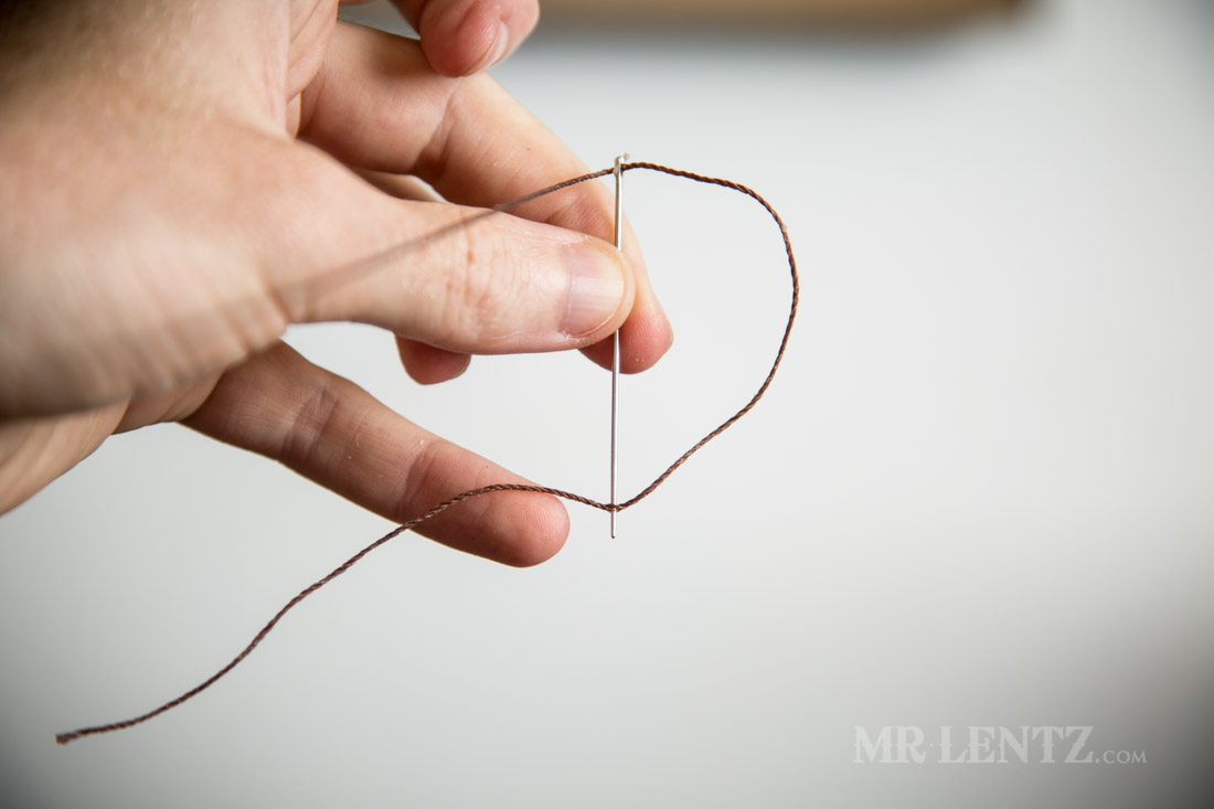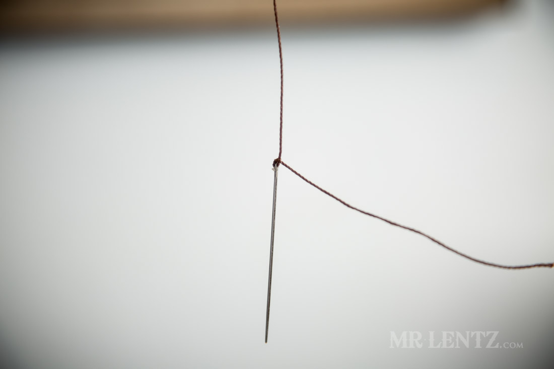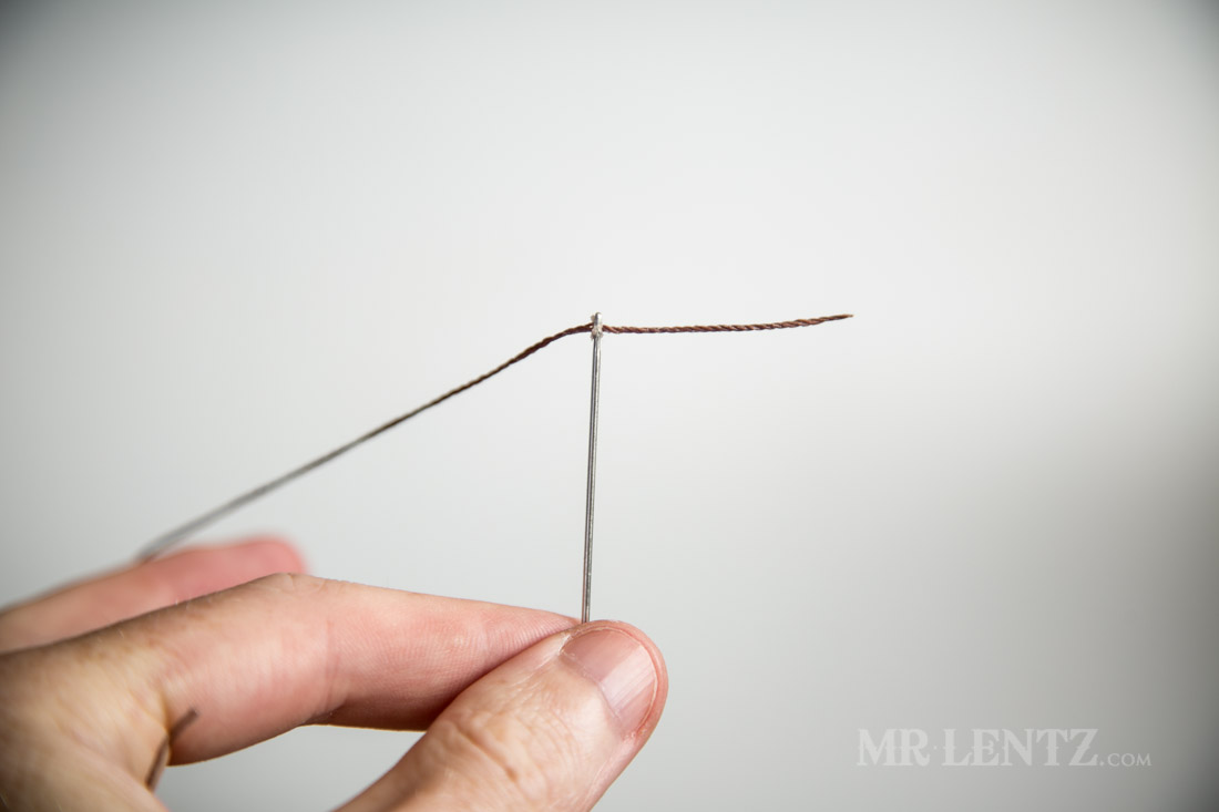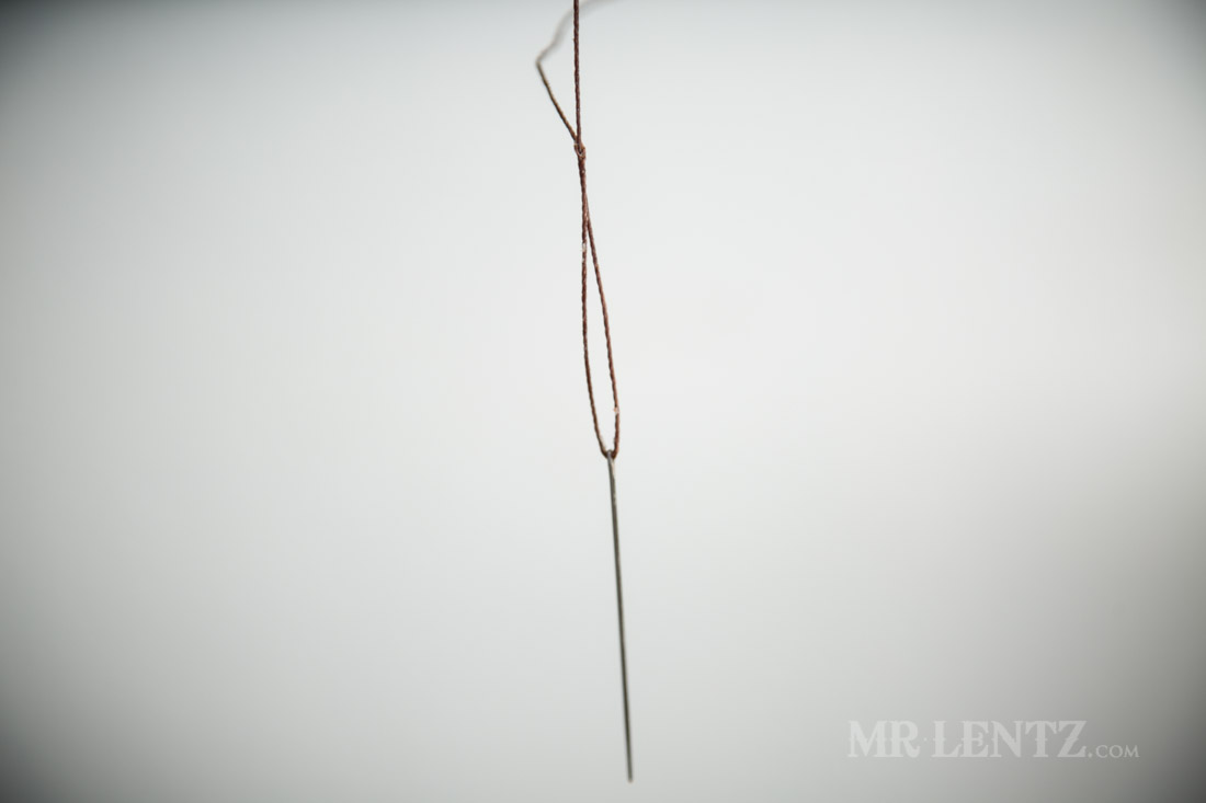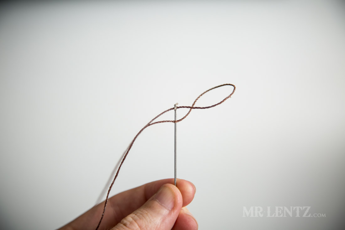 I then pull the thread to tighten the loop around the eye hole. This method keeps the thread as thin as possible, making it easier to pass through tight stitching holes.