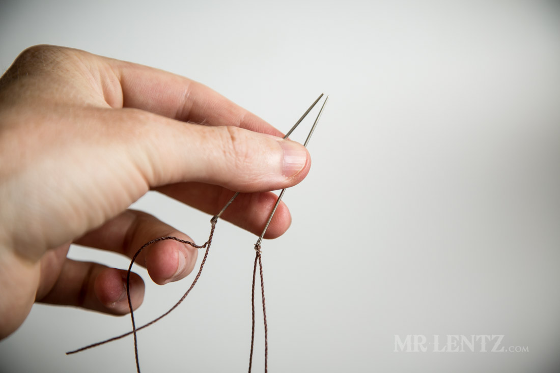 Now that both needles are on the back side of the holster I tie a simple knot behind one of the stitches and cut the thread off. You can then use a lighter to burn the tip so it doesn’t fray.