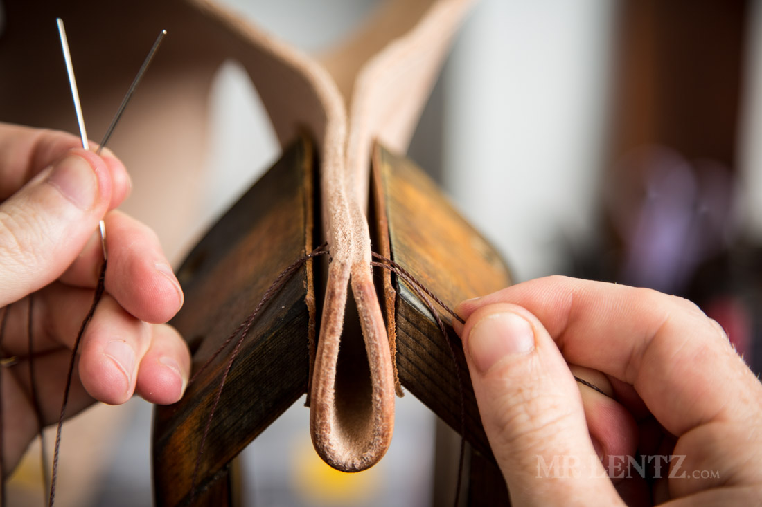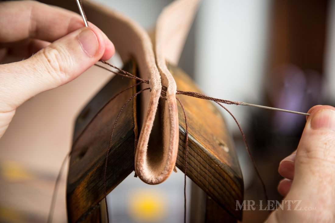 Then drop the thread up and over to the back side of the needle. This creates a loop the needle passes through and is what makes this a ‘saddle stitch’. The saddle stitch is the best stitch in this case due to the fact that if one stitch breaks, the others havea better chance of holding the piece together until you get it repaired.