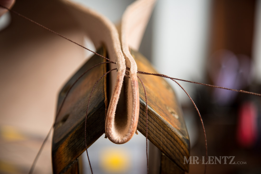 Set your piece up in the stitching pony so that the holes are just above the grips. It may be a bit awkward to get it into position, but do your best. Grab about a length of thread equal to both arms spread wide open, palm to palm, and add an extra foot or two for good measure. Even this short length of stitching requires a lot of thread.
