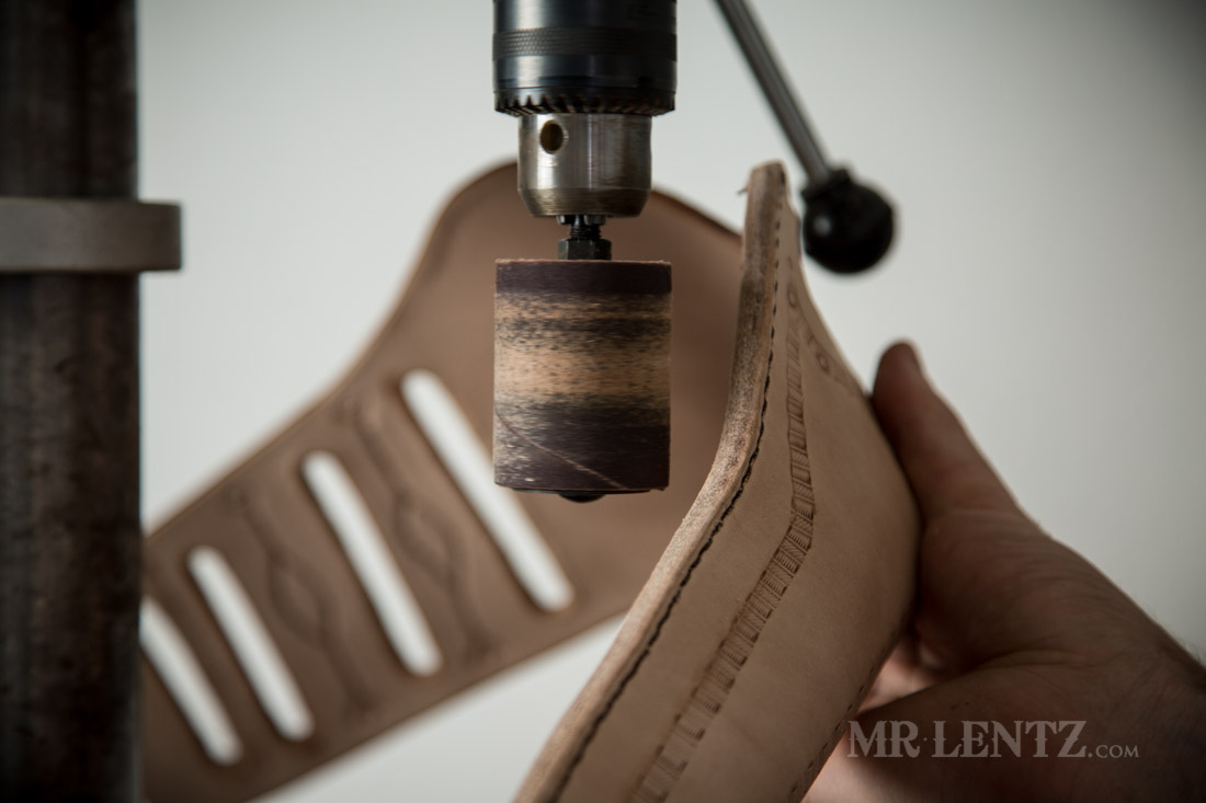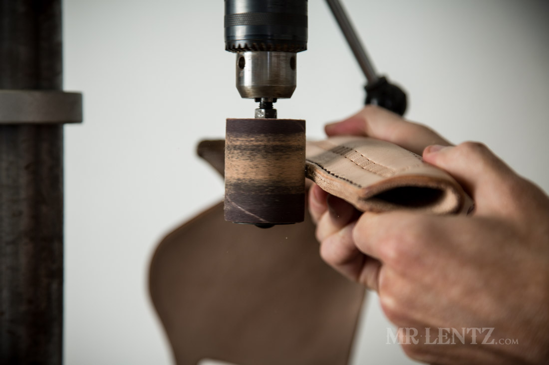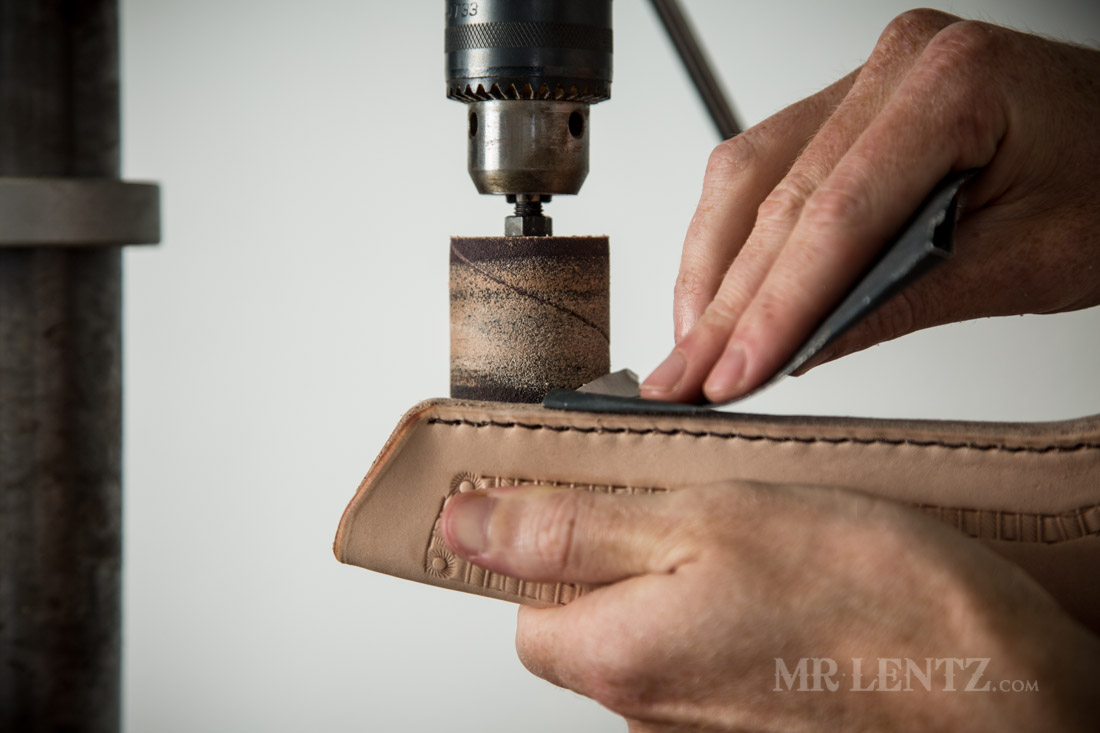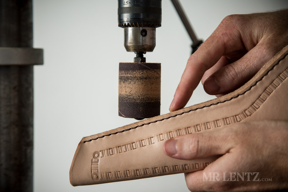 Now we had originally burnished the entire holster except for the stitched edge, and here’s why. The stitched edge sometimes is not perfectly cut or aligned. After stitching you can sand it down nicely with the drum sander.
