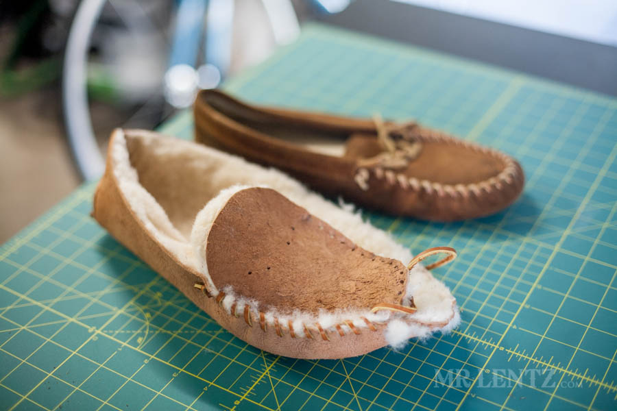 Above, my first attempt sits next to my original pair of Minnetonka’s. I struggled through every single step of this first try…hours and hours of work…only to find that the finished result was a hair too small due to excess fur in the inside, as well it didn’t feel durable on the outside as this is just a shearling’s skin exposed as the ‘flesh’ side out. It’s very brittle and tears easily. I worried about stepping on a rock and the thing splitting in half!