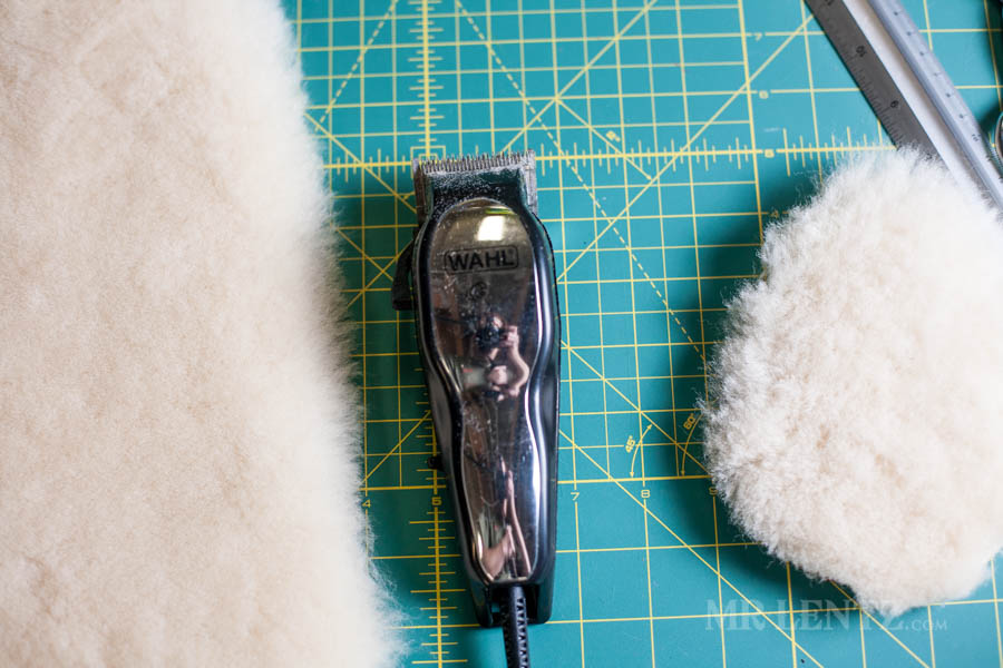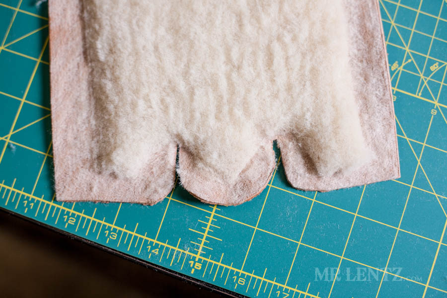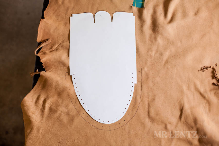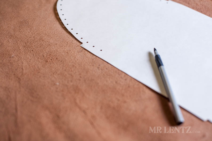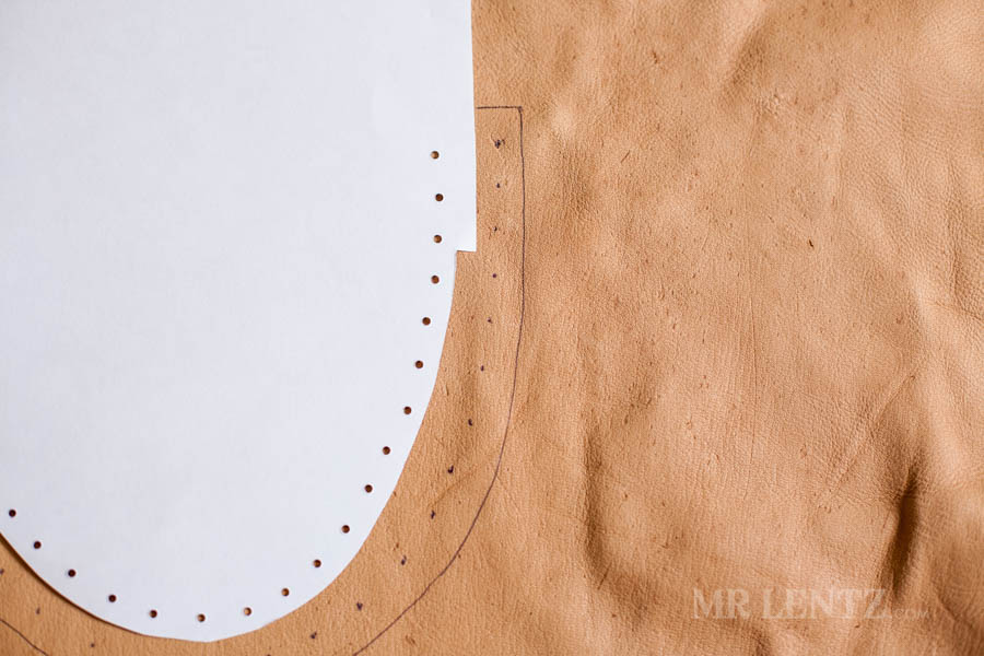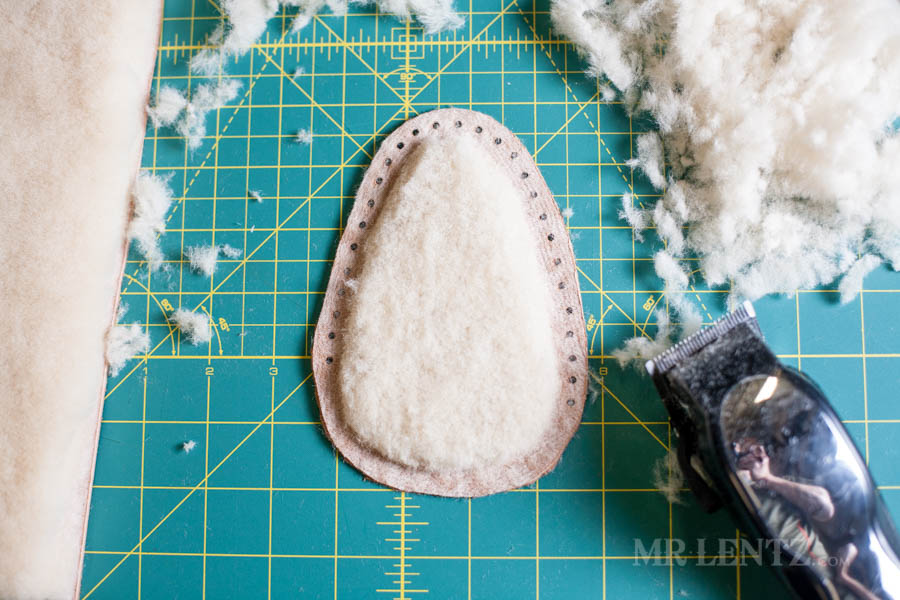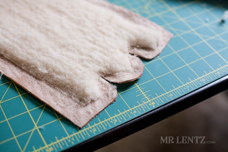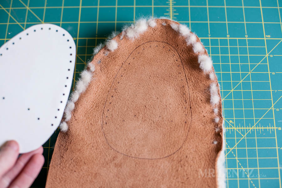 Go ahead and trace out your pattern onto the shearling liner, cut it out, and punch the holes. I used a pen for tracing as it is easier to see and the marks will be covered later with deer skin.