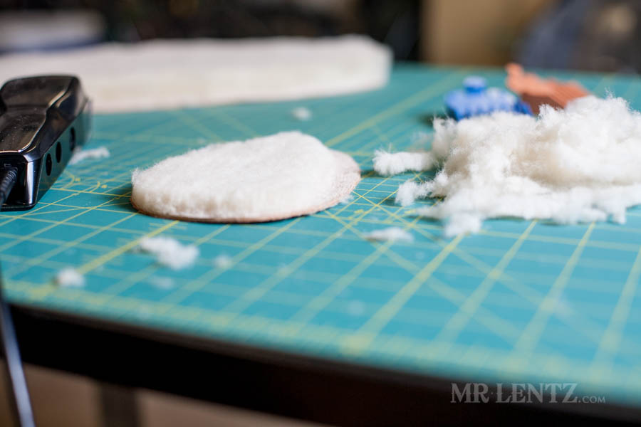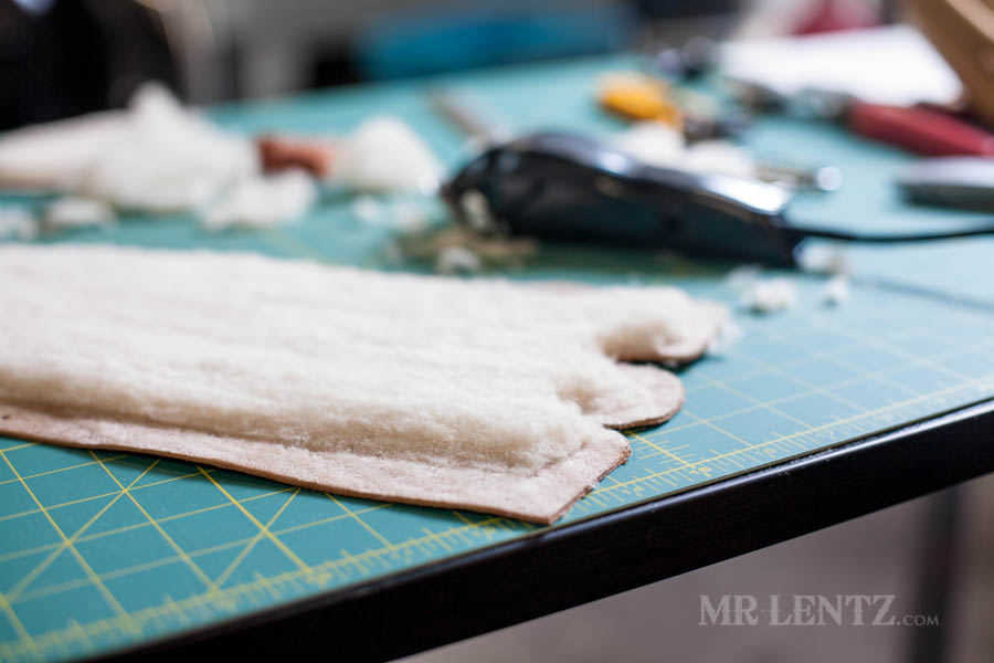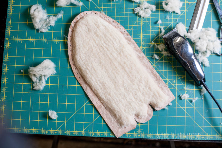 Now I cut out the shearling body liner and punch the holes.