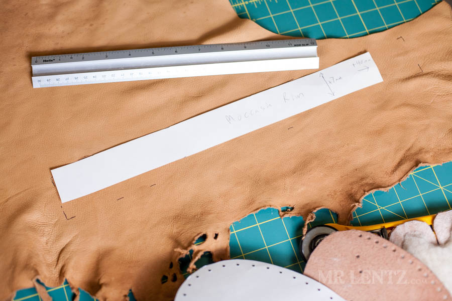 In taking apart your store bought moccasins there should be a long rectangular piece that went around the body to help hold the lace in place. Basically what I did is used that piece and added an extra 1/2 inch in width and 1.5 inches in length. The idea is that you can always cut off extra after you stitch.