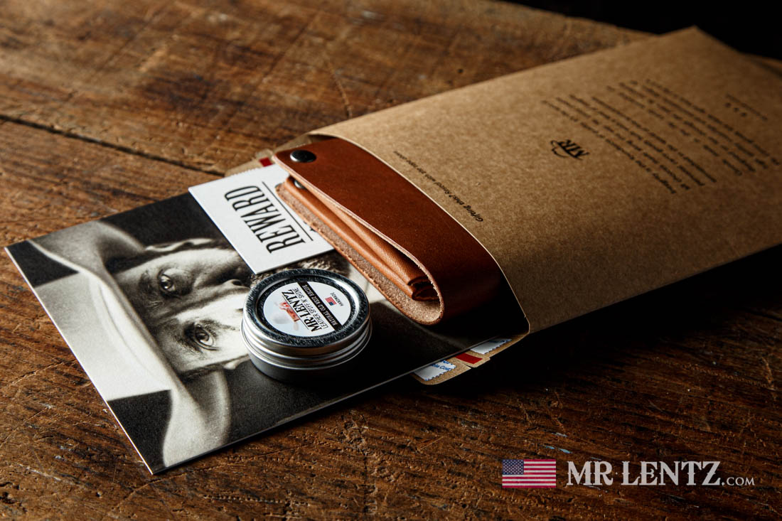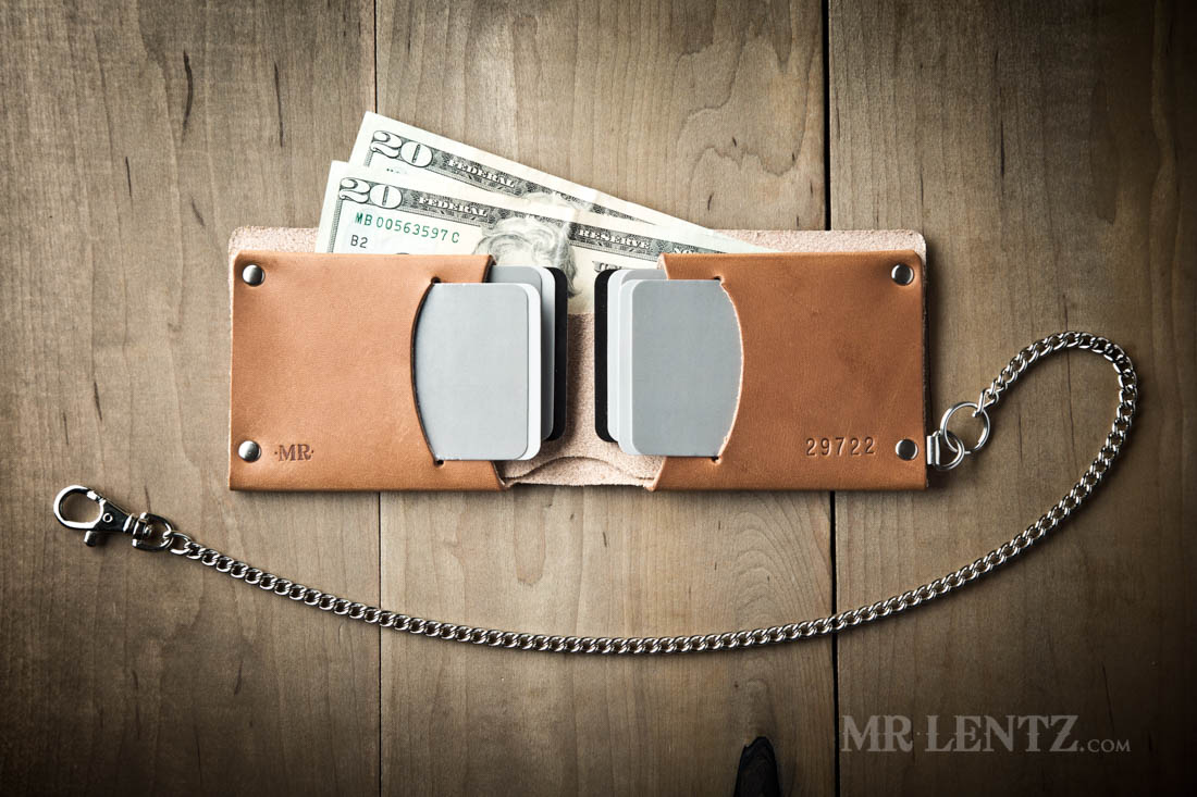 OPTION C – A sturdy Full Grain Leather strap is cut to 7/16″ width and riveted to a stainless steel clip on one end and a stainless steel split ring on the other. The leather color will match your wallet. Measures about 18″ long.