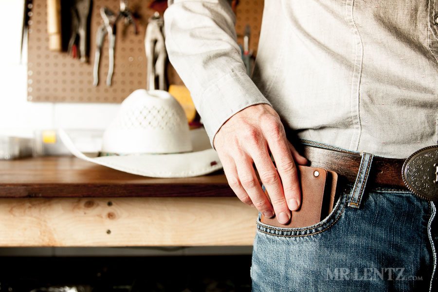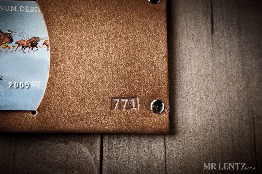 The Mens Leather Wallet will easily fit 6 – 8 cards initially (up to 12 or so once broken in), receipts notes and bills. You must allow the wallet a bit of time to be broken in so that it may stretch to fit your needs. Once fully broken in (about 1-2 weeks or so) you can add even more cards. This wallet is built entirely from one continuous cut of leather folded onto itself and the interior divider will initially be the same length as the outer piece. The exterior leather will eventually break in and lengthen slightly more than the divider as is typical in traditionally cut wallets.