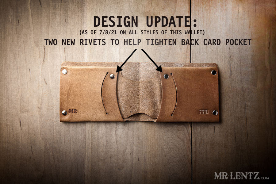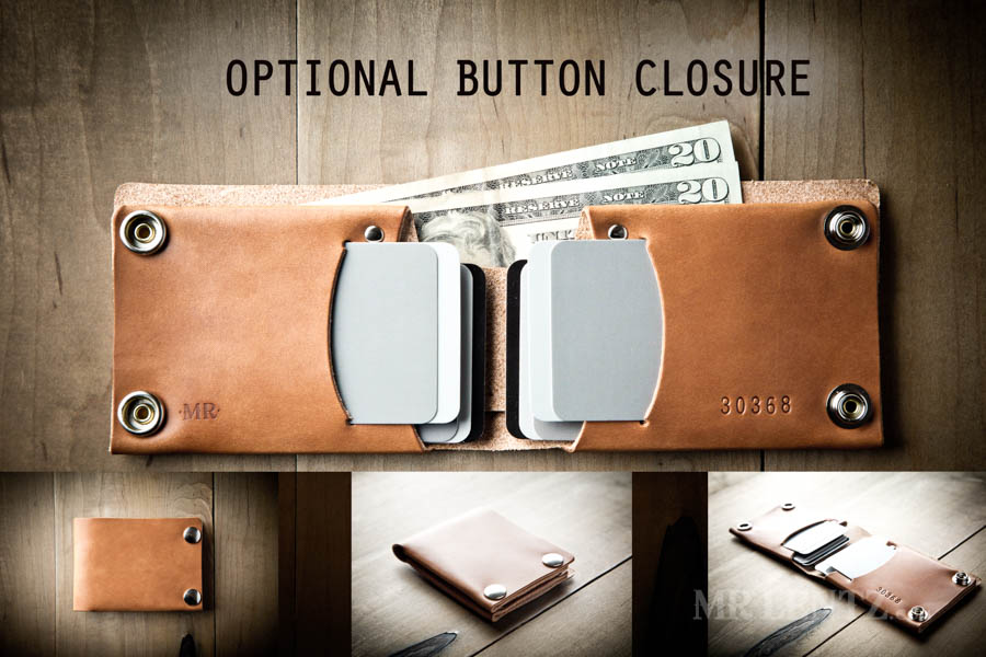 This wallet now comes with the option to add Button Snaps to help keep your cards and cash secure, and the wallet closed. It’s perfect for those needing that extra bit of security and works great if you tend to toss your wallet on a shelf, in your day bag, or on your desk. If you opt for the Button Snaps, we will install them on the edges of the wallet as shown in the photos. The buttons are solid brass and come in two finishes: Silver or Golden, they increase the height and length of the wallet marginally to accommodate placement. In addition – all options will include two rivets installed just behind the card slots to tighten up the card pocket area.