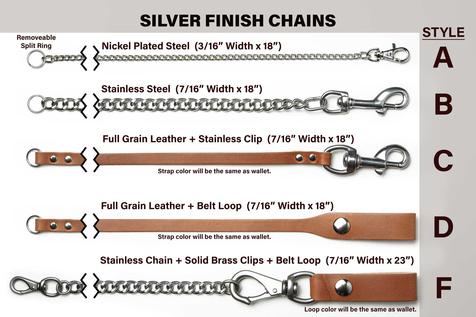 OPTION F – This chain combines my stainless steel version and a leather belt loop snap so you can fit it over any belt up to 1.75″ wide. The clips are very durable and made of solid brass with nickel plating. Designed to easily clip and unclip from your wallet. This is the top end of wallet chains.