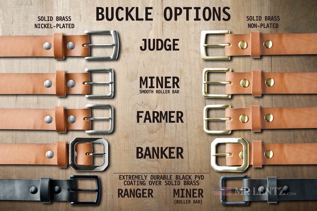 Most buckles are available both in Solid Brass as well as Nickel Plated Solid Brass. The Miner Buckle has a roller on the end of it. Exact buckle shapes may vary slightly over time as our buckle supplier alters the design.