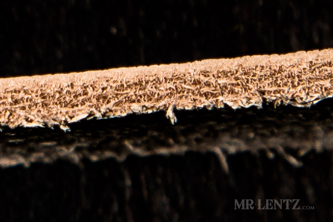 This is a cross-section photo of my belt leather. It’s as close as I could get, but you can see the different layers in action. That nice thin line at the top is the most tightly packed layers of fibers and it’s what gives Full Grain Leather its strength.