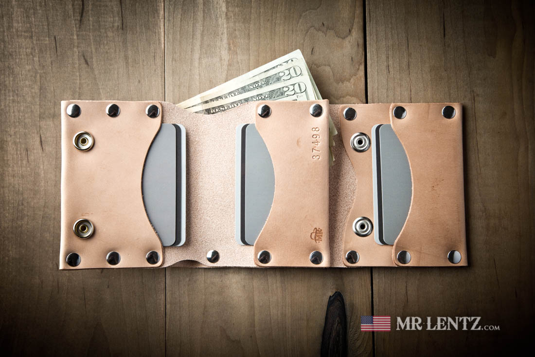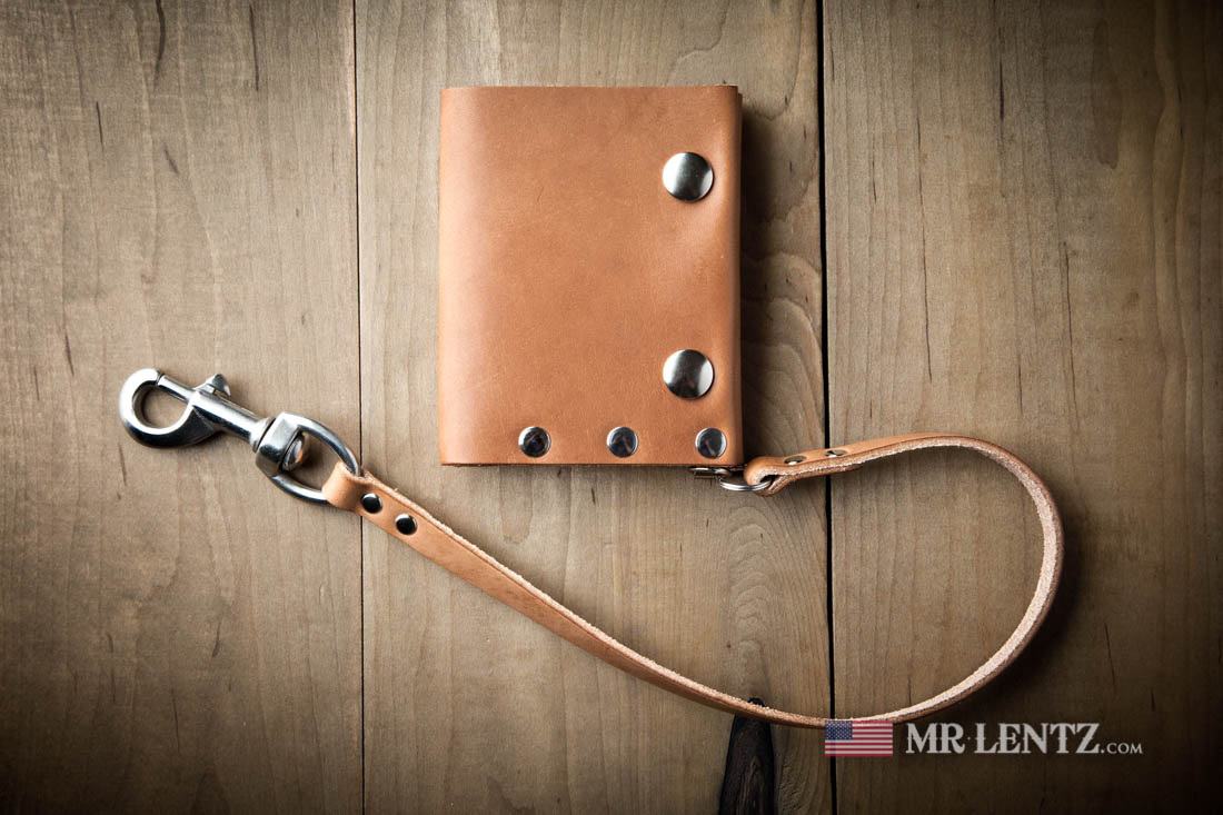 OPTION C – A sturdy Full Grain Leather strap is cut to 7/16″ width and riveted to a stainless steel clip on one end and a stainless steel split ring on the other. The leather color will match your wallet. Measures about 18″ long.