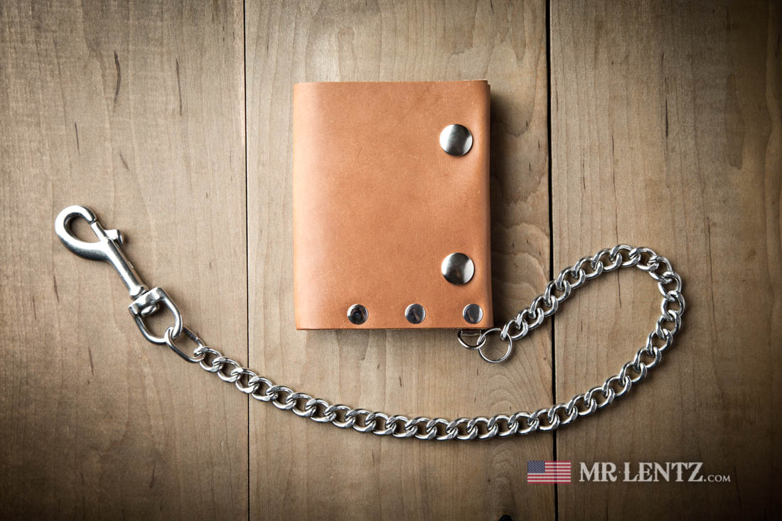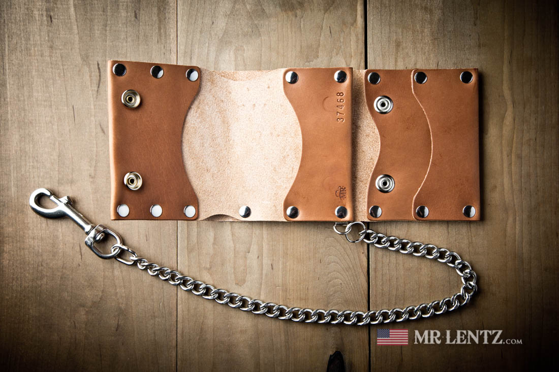 OPTION K – A nice heavy weight chain made of solid brass with a durable solid brass clip. Measures 18 inches long and a chain width of 3/8″ wide. Solid brass will develop a beautiful patina as it ages with the wallet.