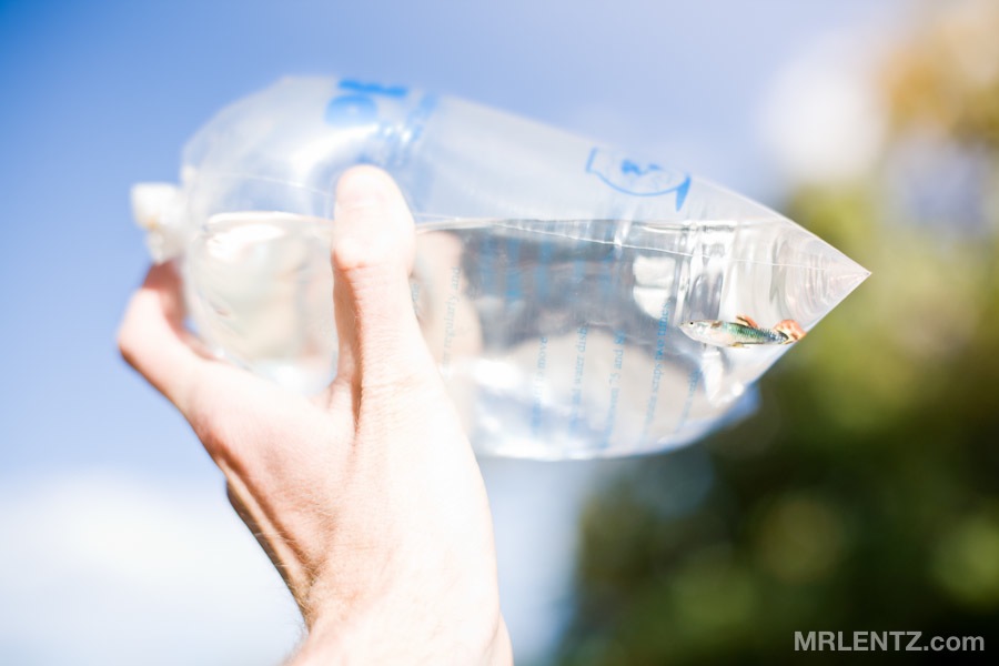 Here is the Guppy I promised to the 2nd place winner, Olivia, in my August Giveaway Extravaganza. This sucker took me at least 10 minutes to photograph, he kept swimming to the bottom, out of view, so finally I held him up to the sky and told him if he didn’t pose now, he would be living in this bag for the rest of his life. One thing to note: apparently Guppy fish breed like rabbits. Good thing I only bought one.