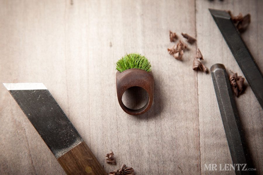 Each ring created so far is made with real grass or moss that has been dried and preserved to maintain its color and texture. The grass and moss is embedded into the wood and requires no maintenance whatsoever. Though you may want to rub on a little extra virgin olive oil onto the wood every few months if necessary.