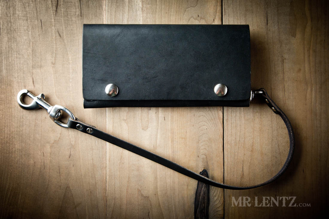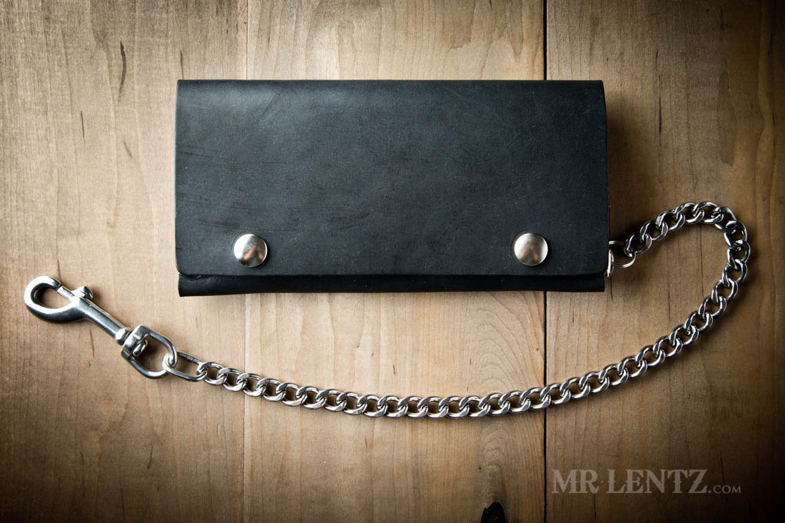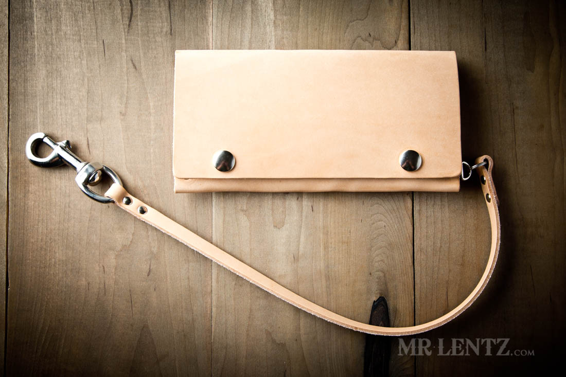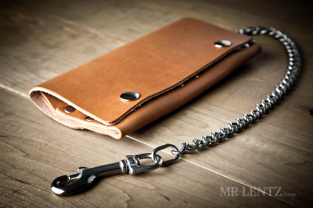 OPTION D – This leather chain strap ends in a snapping belt loop meant to go over belts up to 1.75″ wide. Made from one piece of solid full-grain leather, the other end attaches you your wallet via a stainless steel split ring. Leather color will match your wallet. Measures about 18″ long from end to end, 7/16″ width on strap section, and 7/8″ width on snap section.