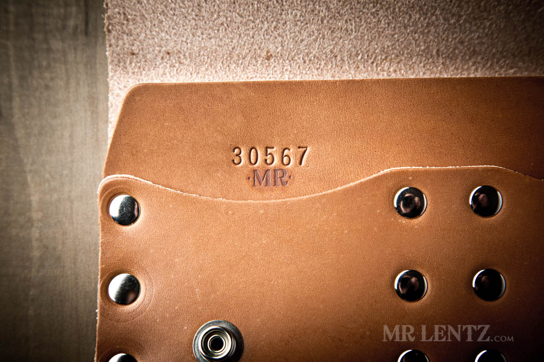 The wallet measures 7 7/8 inches wide x 4 inches tall and around 1/2 inch thick when folded. Personalization on this wallet will go on the inside, centered and just below the first line of rivets.