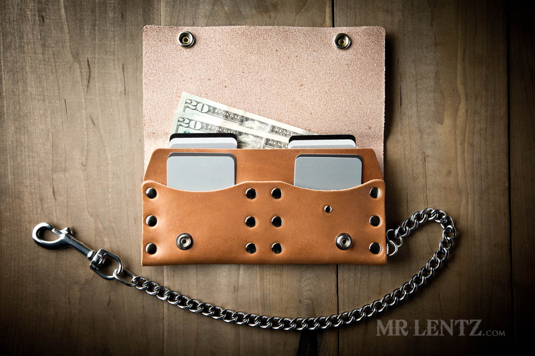 OPTION K – A nice heavy weight chain made of solid brass with a durable solid brass clip. Measures 18 inches long and a chain width of 3/8″ wide. Solid brass will develop a beautiful patina as it ages with the wallet.