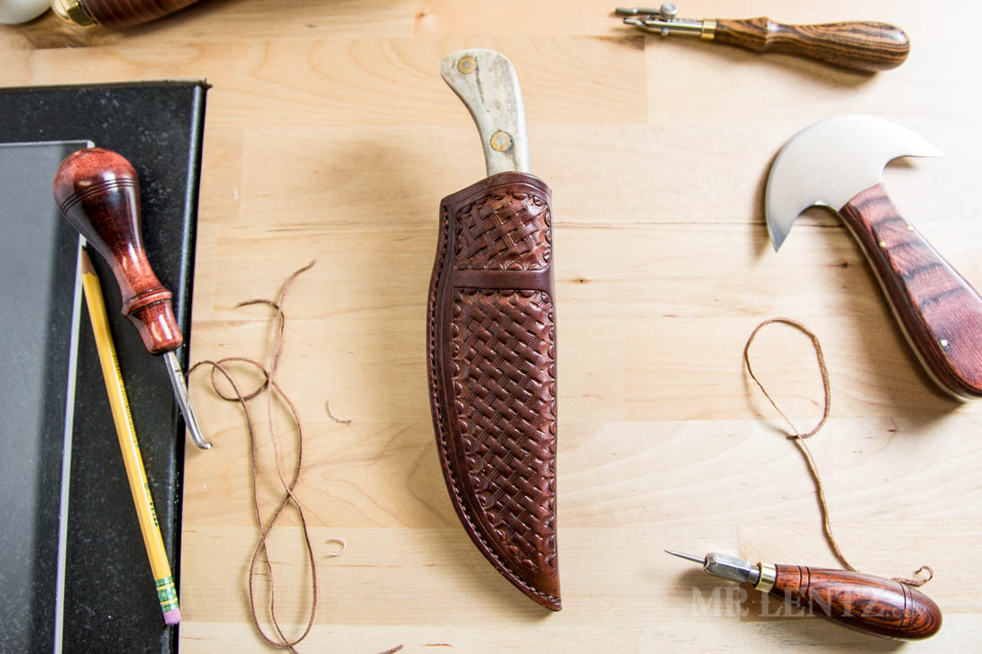 Here’s a sheath tooled for my round knife. With a solid tooling bench you don’t have to worry about the tools jumping around on you when using the mallet.